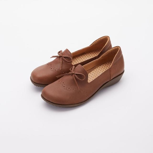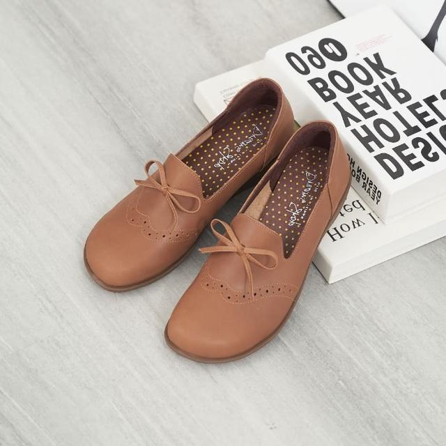 DREAMS SHOP寬楦_MIT真皮蝴蝶結雕花方頭平底娃娃鞋 棕色 大尺碼女鞋37-45