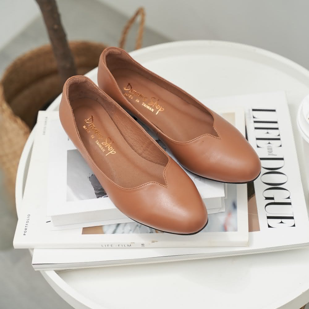 DREAMS SHOP寬楦_MIT真皮素面V口小圓尖低跟鞋 棕色