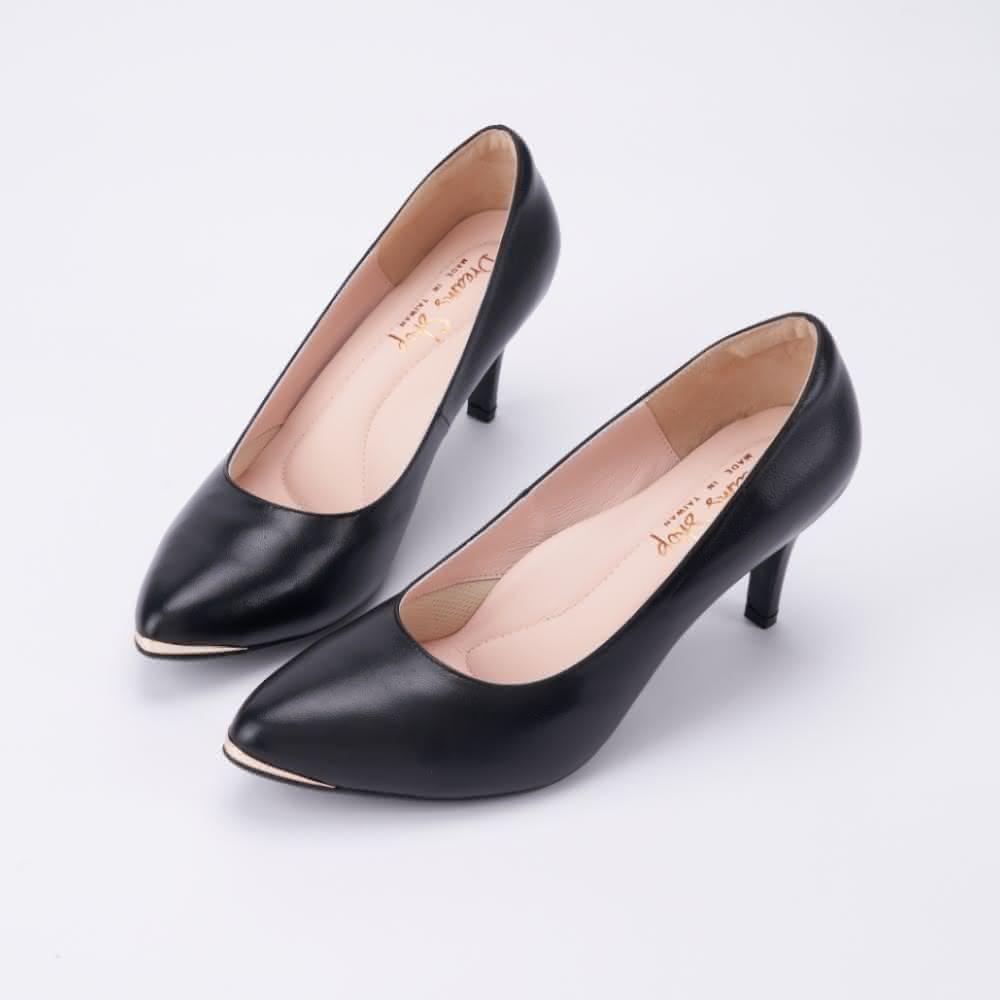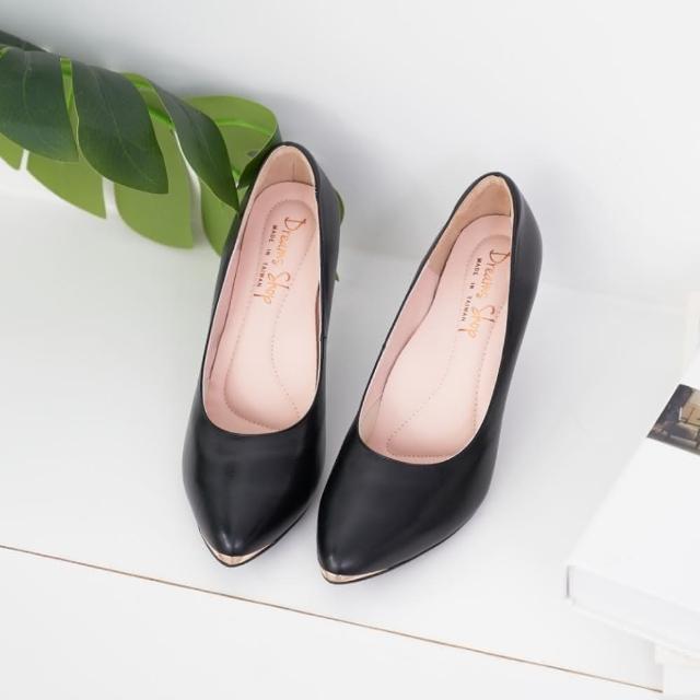 DREAMS SHOP氣墊_MIT真皮金屬V頭尖頭高跟鞋 黑色 大尺碼女鞋37-44