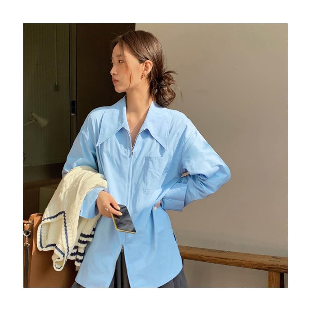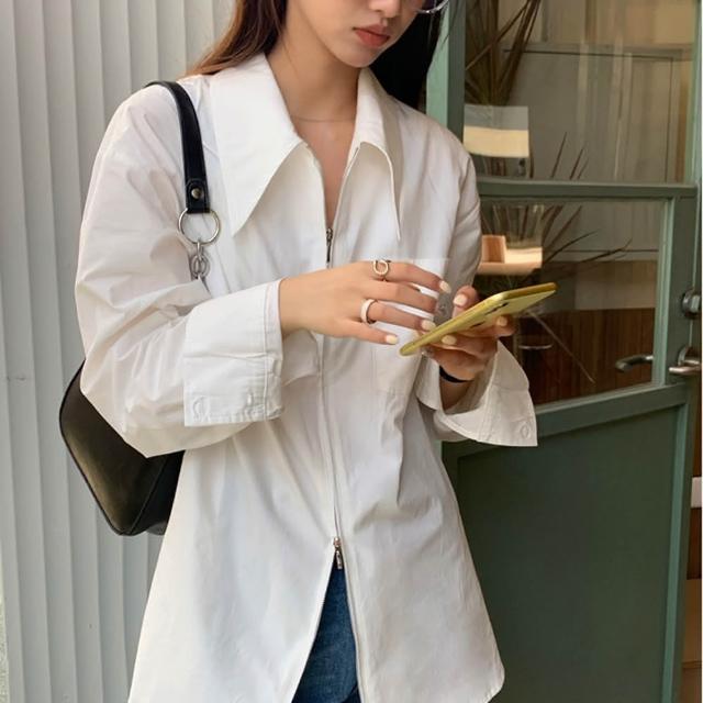 HanVo現貨 法式感長袖大尖領襯衫(雙拉鍊個性設計 時髦百搭寬鬆襯衫上衣 女生衣著 A02-1876)
