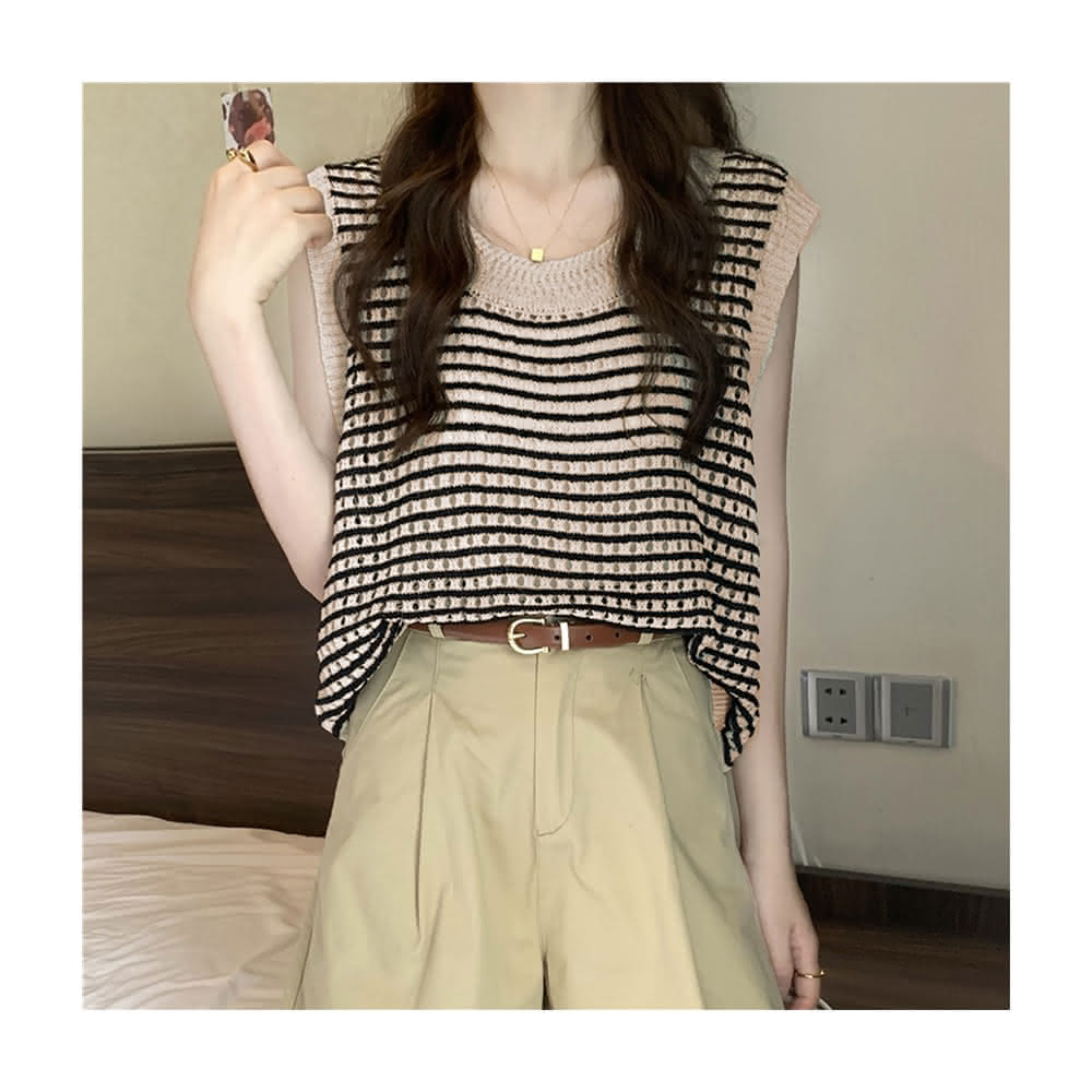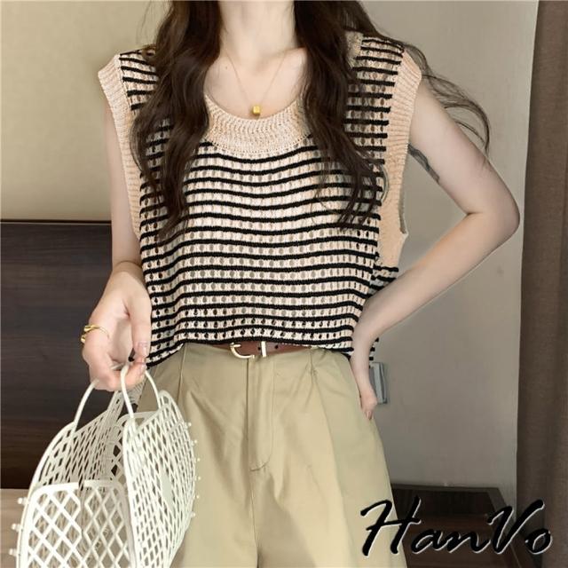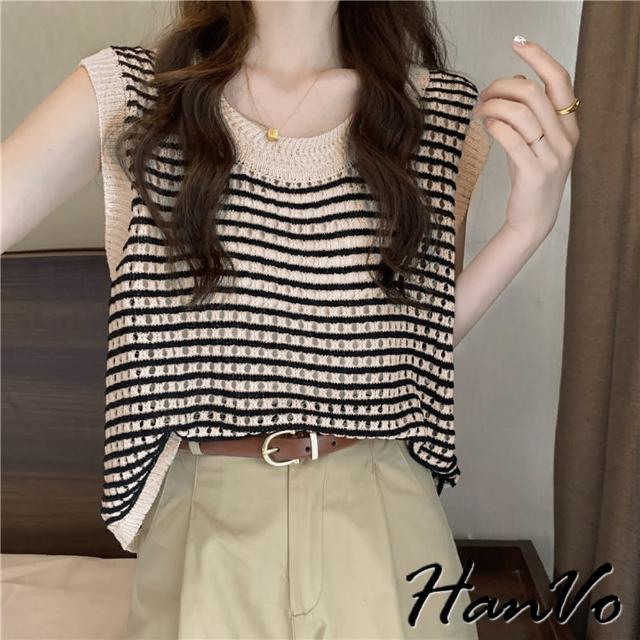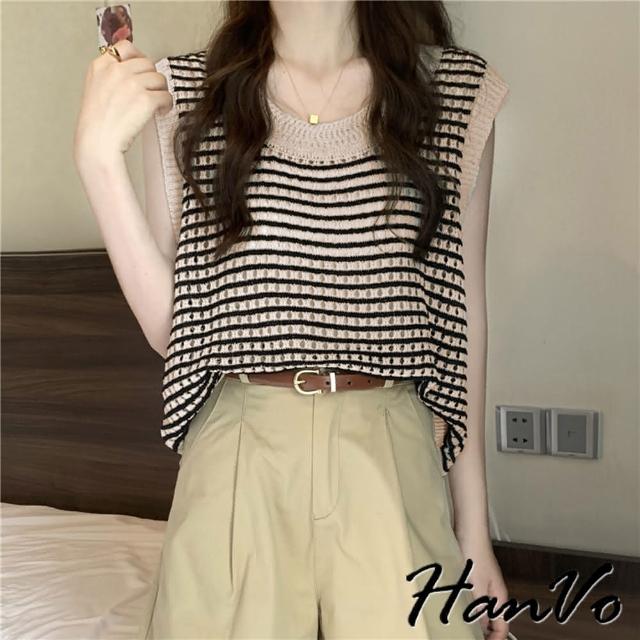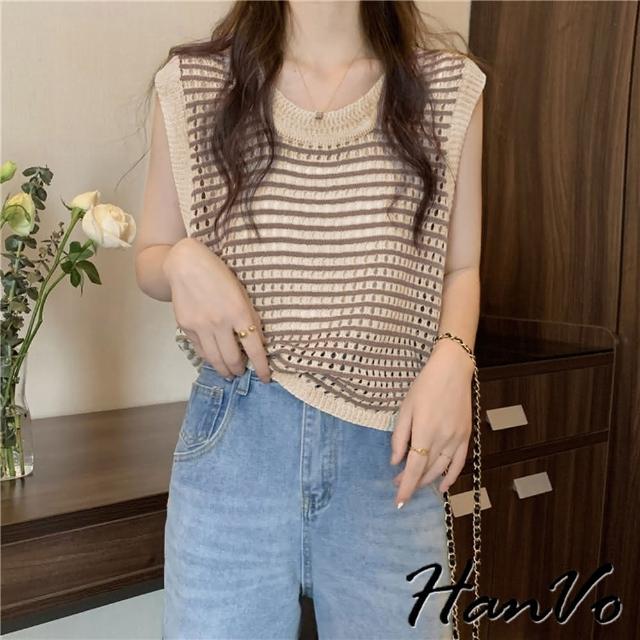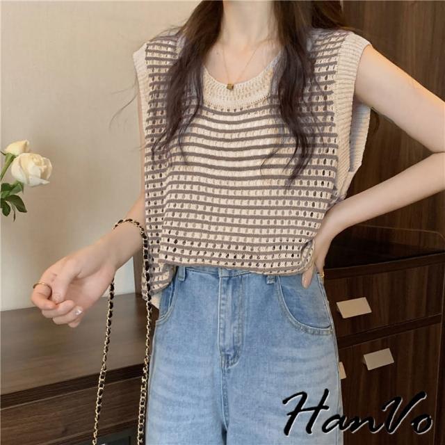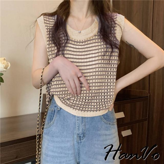 HanVo現貨 百搭條紋鏤空針織短版背心(舒適透氣流行 韓系簡約百搭 韓系女裝 女生衣著 A01-0075)