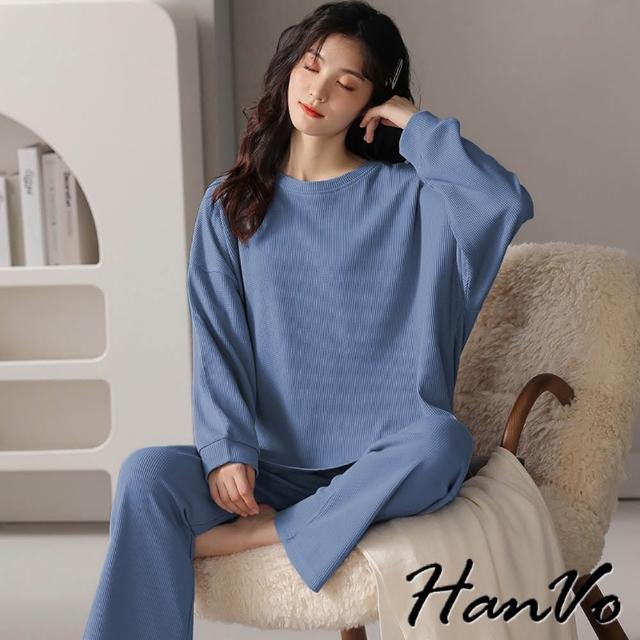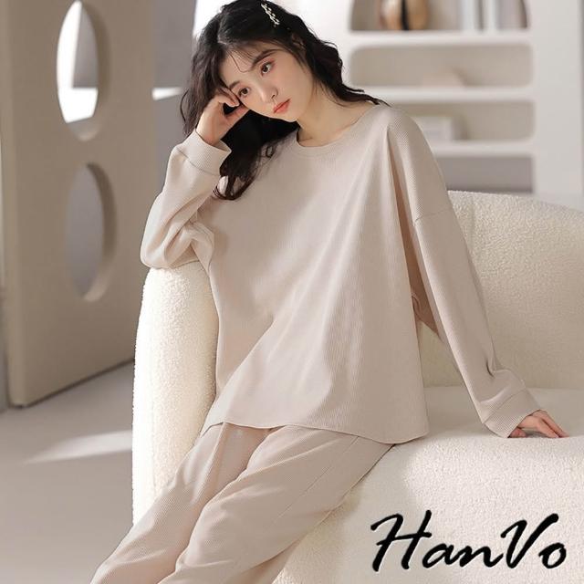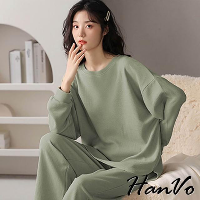 HanVo現貨 華夫格圓領長袖長褲居家睡衣(親膚寬鬆柔軟舒適休閒套裝 日常居家服 女生衣著 A08-5975)