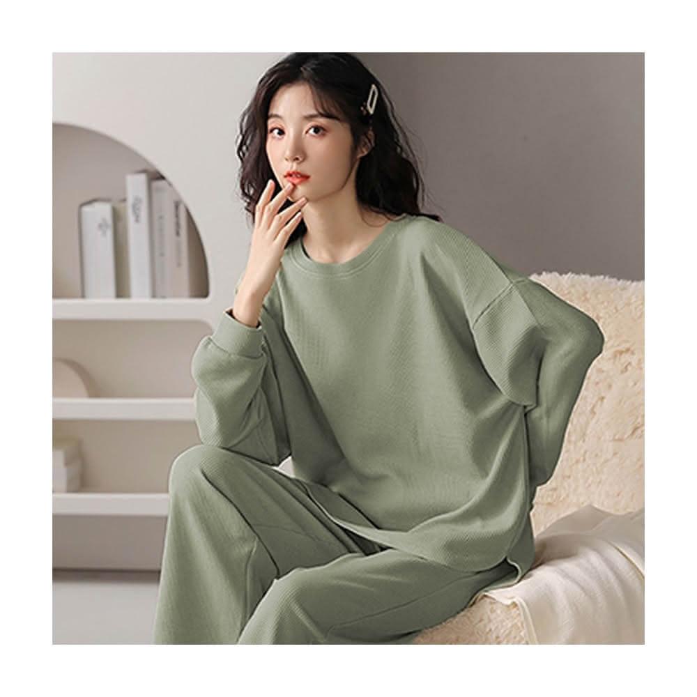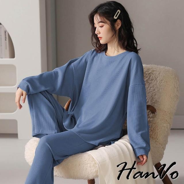 HanVo現貨 華夫格圓領長袖長褲居家睡衣(親膚寬鬆柔軟舒適休閒套裝 日常居家服 女生衣著 A08-5975)