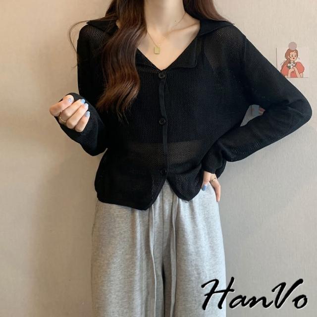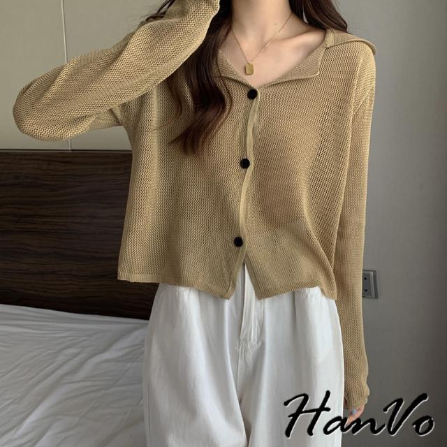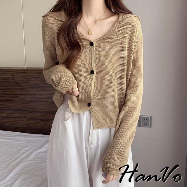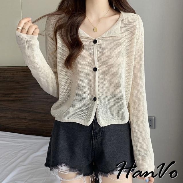 HanVo現貨 慵懶風翻領洞洞針織外套(別緻排扣薄款防曬衫 韓系女裝 女生衣著 A07-4004)