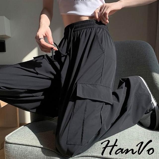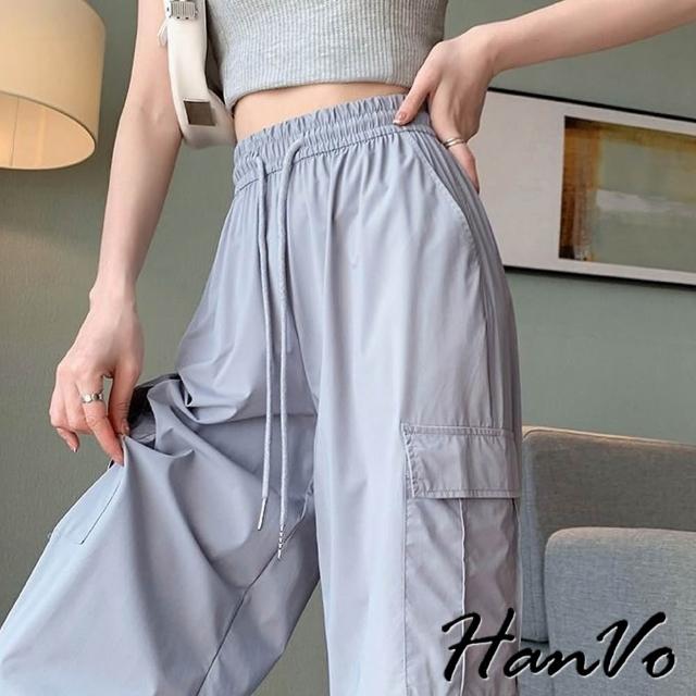HanVo現貨 側邊大口袋輕薄抽繩工裝褲(速乾冰絲休閒直筒闊腿褲 韓系休閒褲 女生長褲 A04-2625)