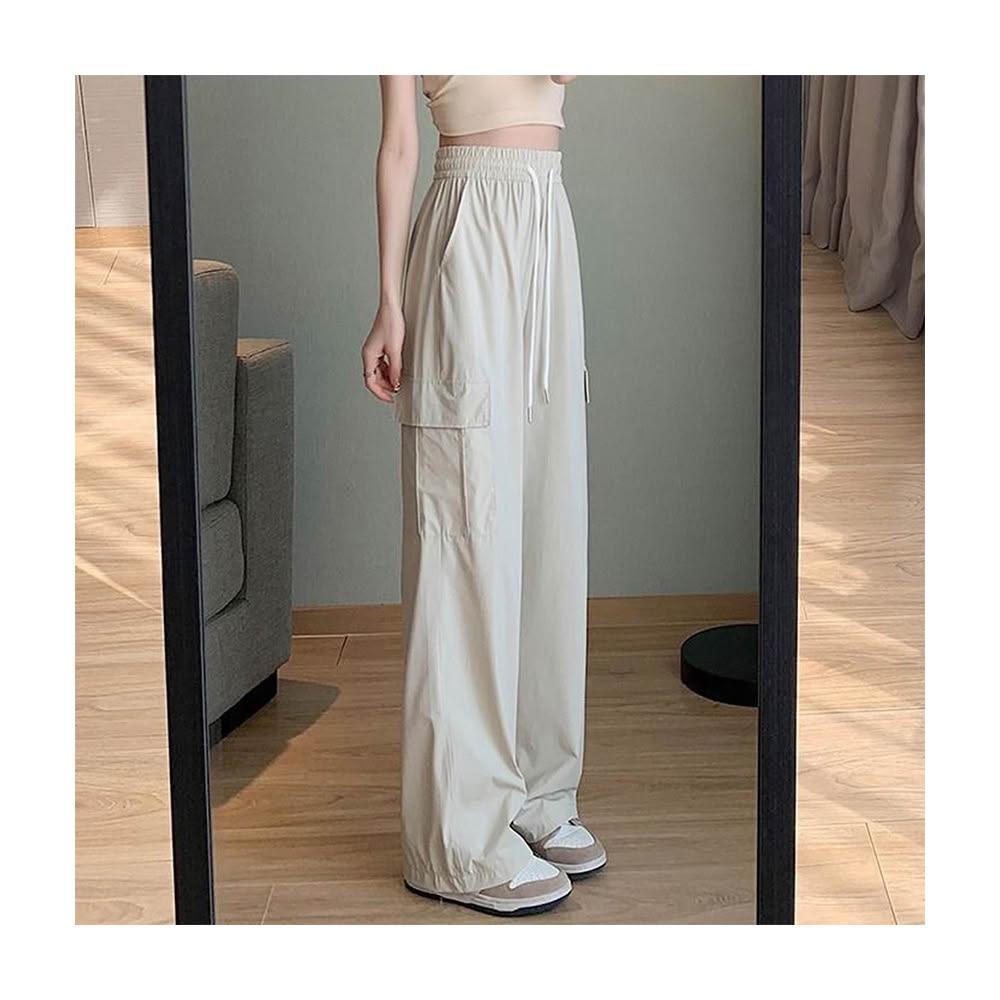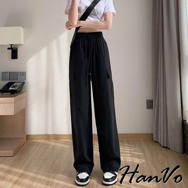 HanVo現貨 側邊大口袋輕薄抽繩工裝褲(速乾冰絲休閒直筒闊腿褲 韓系休閒褲 女生長褲 A04-2625)
