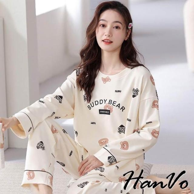 HanVo現貨 滿版熊熊可愛居家睡衣套裝 薄款寬鬆休閒 春秋居家服 女生衣著 A08-7011