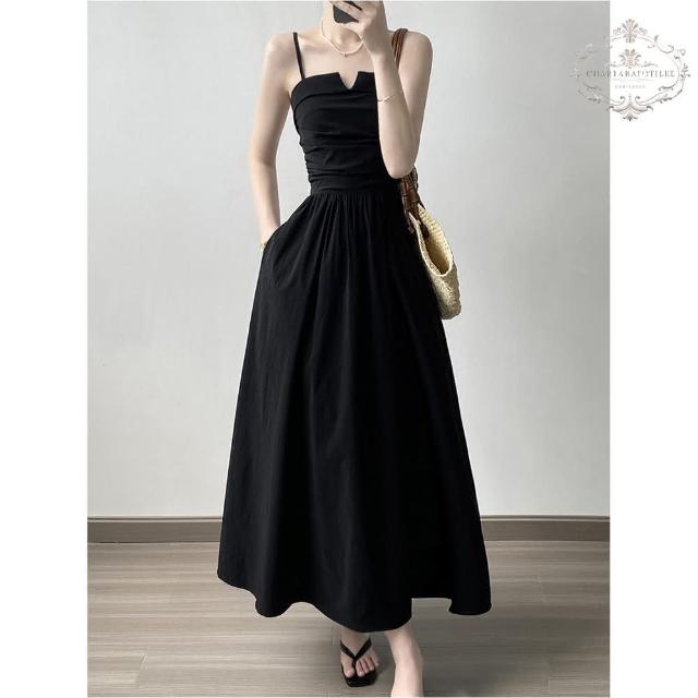 Charlotte 夏綠蒂Charlotte 法式復古收腰A字抹胸長裙 褶皺吊帶連身裙 無袖平紋人棉吊帶裙 CHSK140