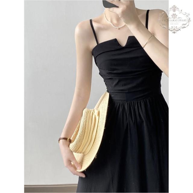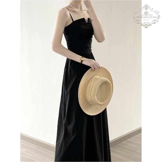 Charlotte 夏綠蒂Charlotte 法式復古收腰A字抹胸長裙 褶皺吊帶連身裙 無袖平紋人棉吊帶裙 CHSK140