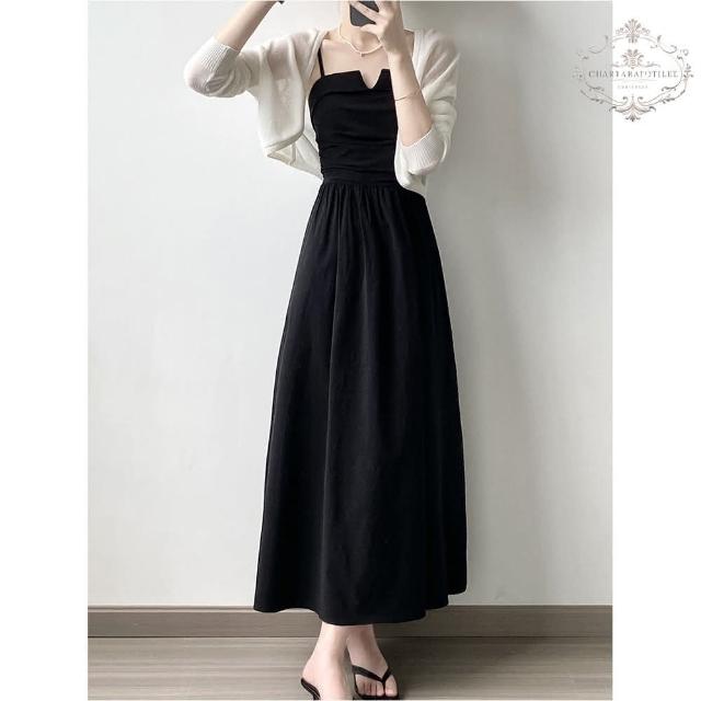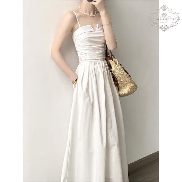 Charlotte 夏綠蒂Charlotte 法式復古收腰A字抹胸長裙 褶皺吊帶連身裙 無袖平紋人棉吊帶裙 CHSK140