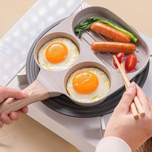 鼎匠升級版★三合一早餐煎蛋鍋雞蛋漢堡鍋牛排麥飯石不沾平底鍋(米白2圓孔+1長方型煎荷包蛋模具電磁爐)