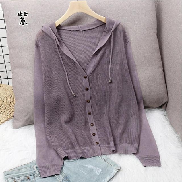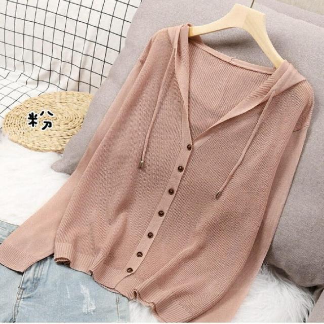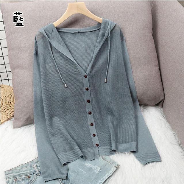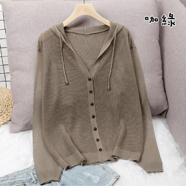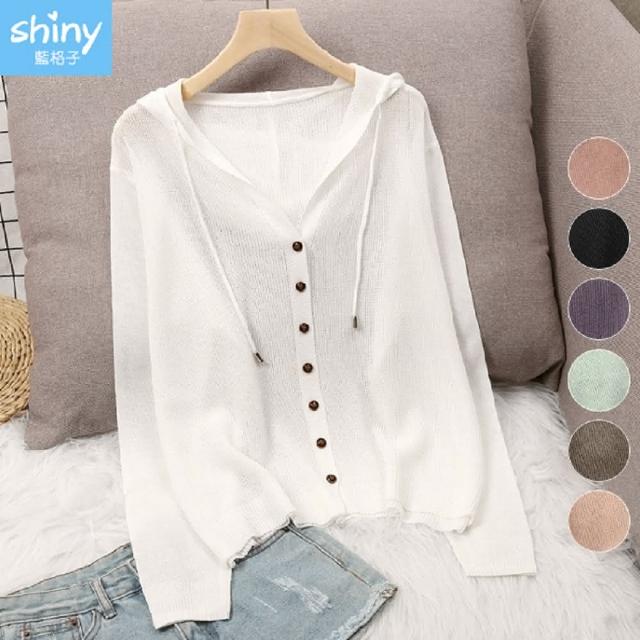 Shiny 藍格子純色排釦鏤空防曬抽繩連帽薄外套 V3736 現+預(女裝)
