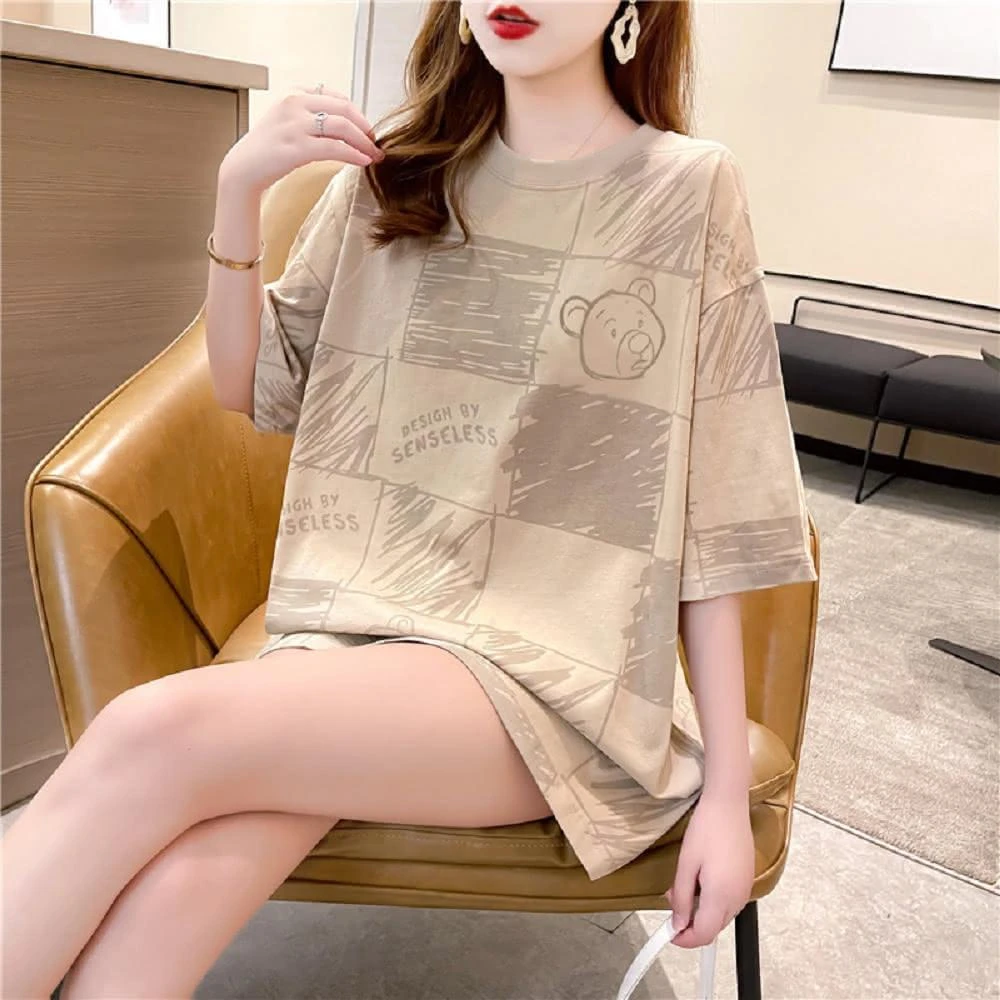 Shiny 藍格子塗鴉小熊方格印花寬鬆圓領短袖T恤上衣 V3784(女裝)