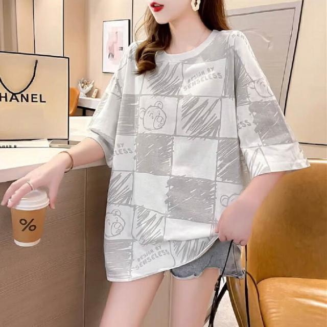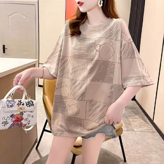 Shiny 藍格子塗鴉小熊方格印花寬鬆圓領短袖T恤上衣 V3784(女裝)