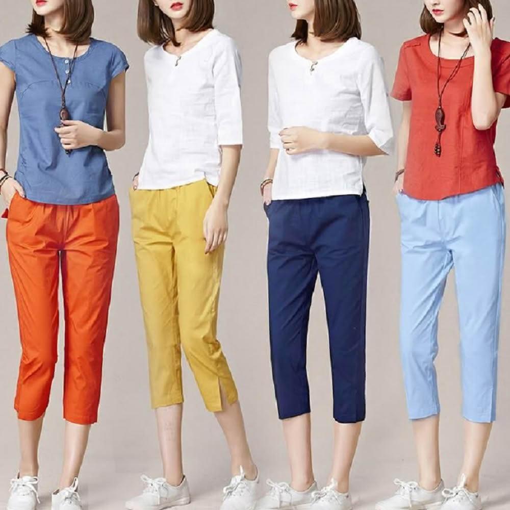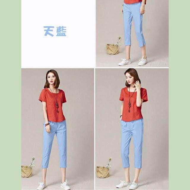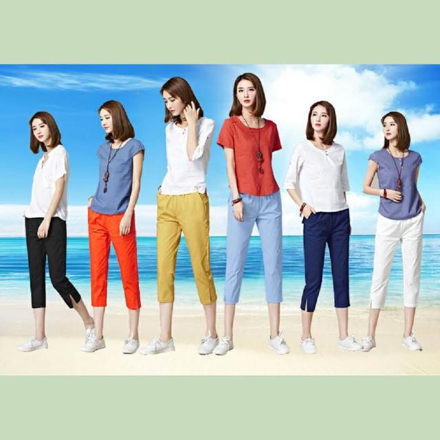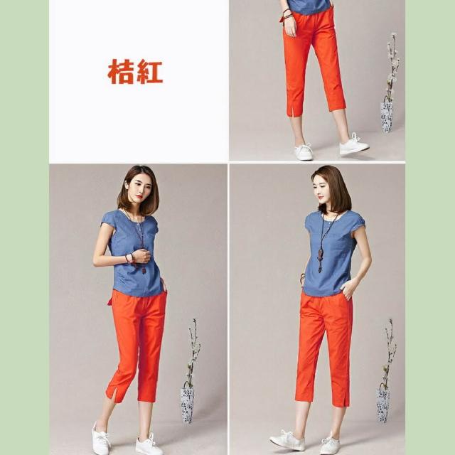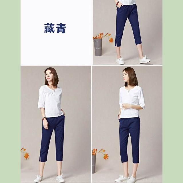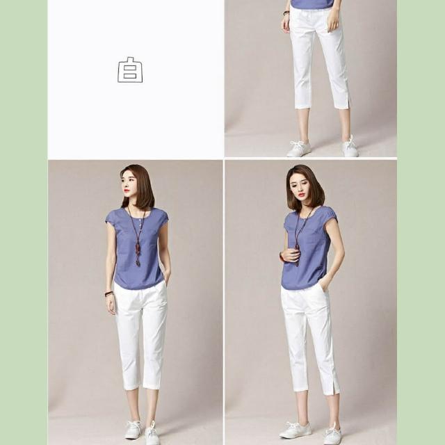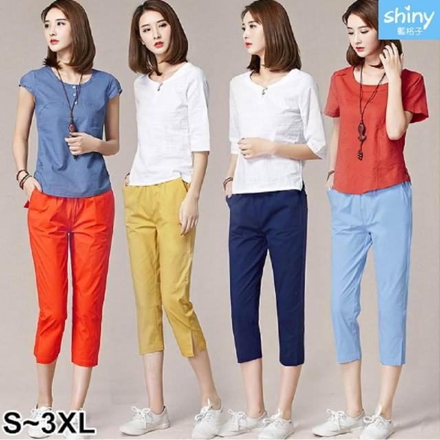 Shiny 藍格子純色鬆緊腰棉麻開叉七分休閒褲 V3605(女褲 長褲)
