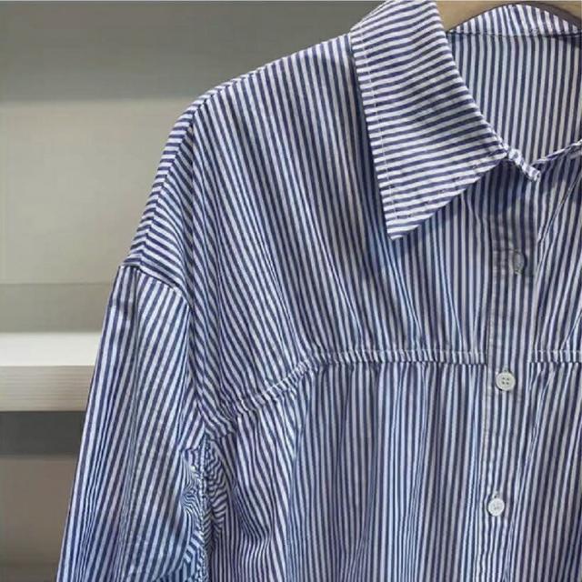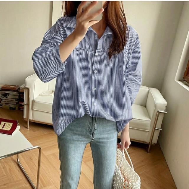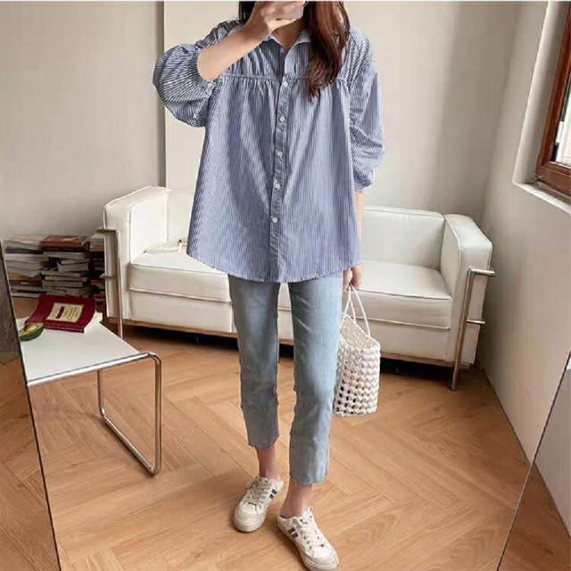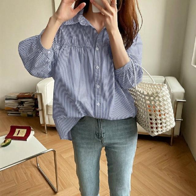 Shiny 藍格子簡約直條紋寬鬆泡泡袖襯衫上衣 V3489(女裝)