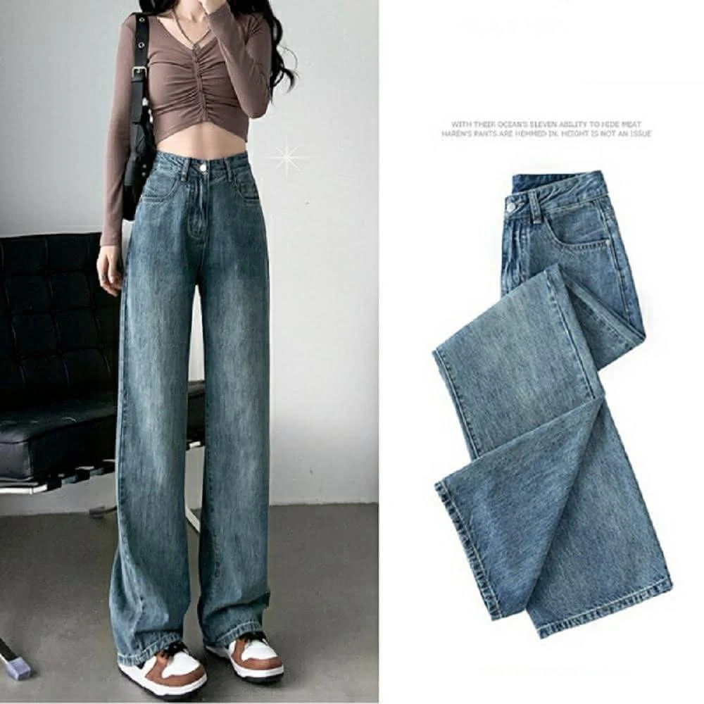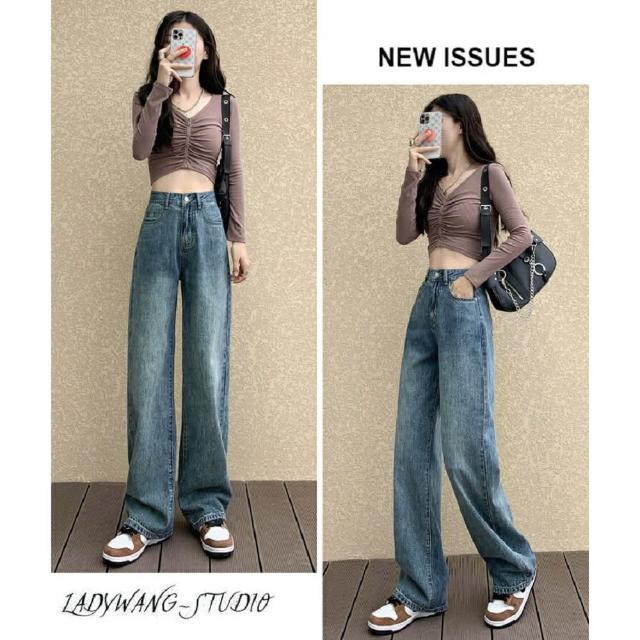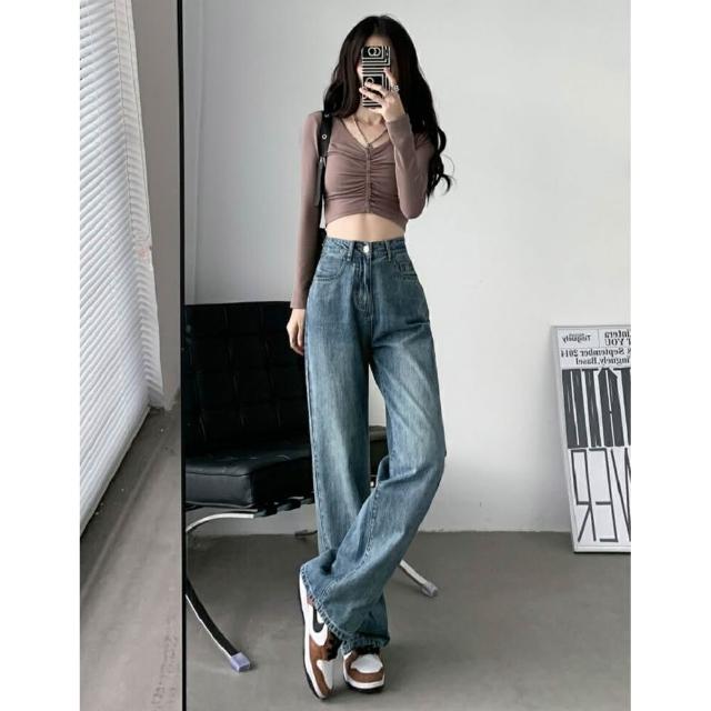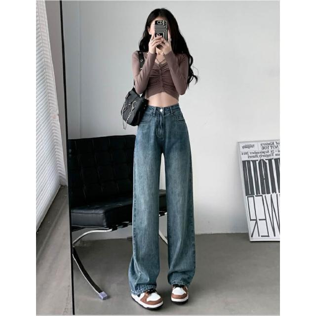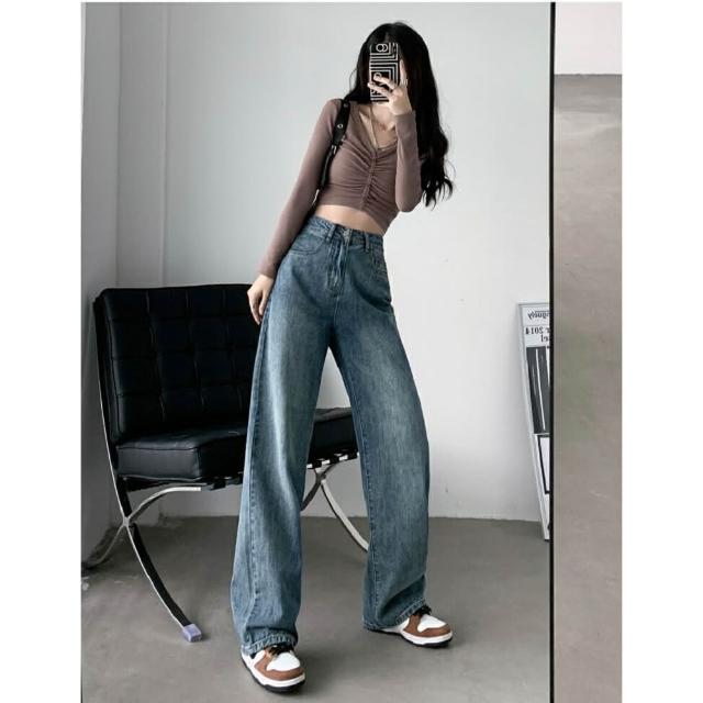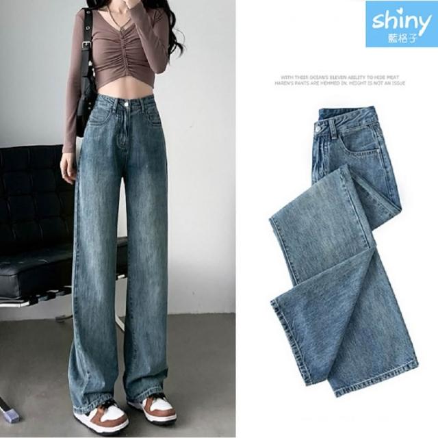 Shiny 藍格子高腰顯瘦復古寬鬆垂感直筒牛仔褲 V3727(女褲)