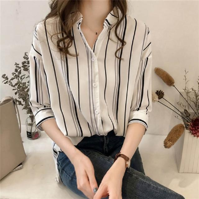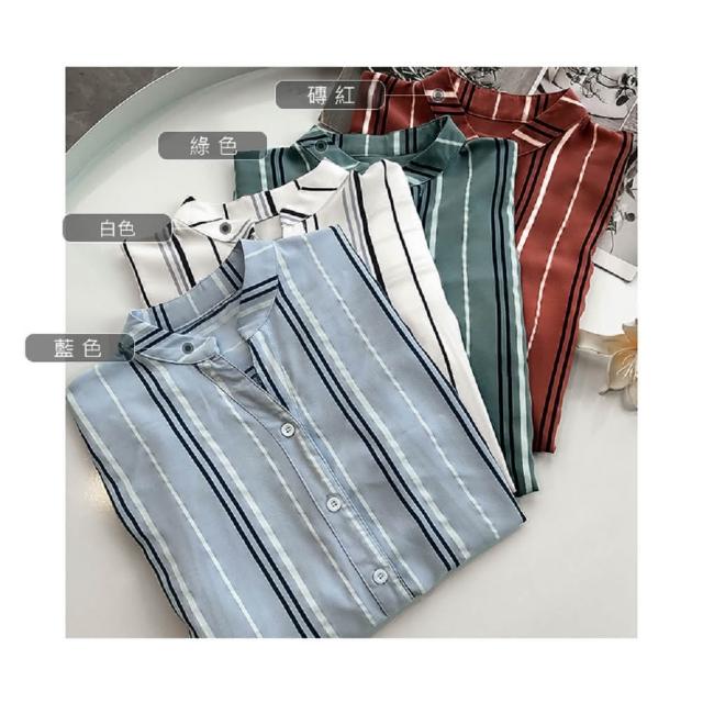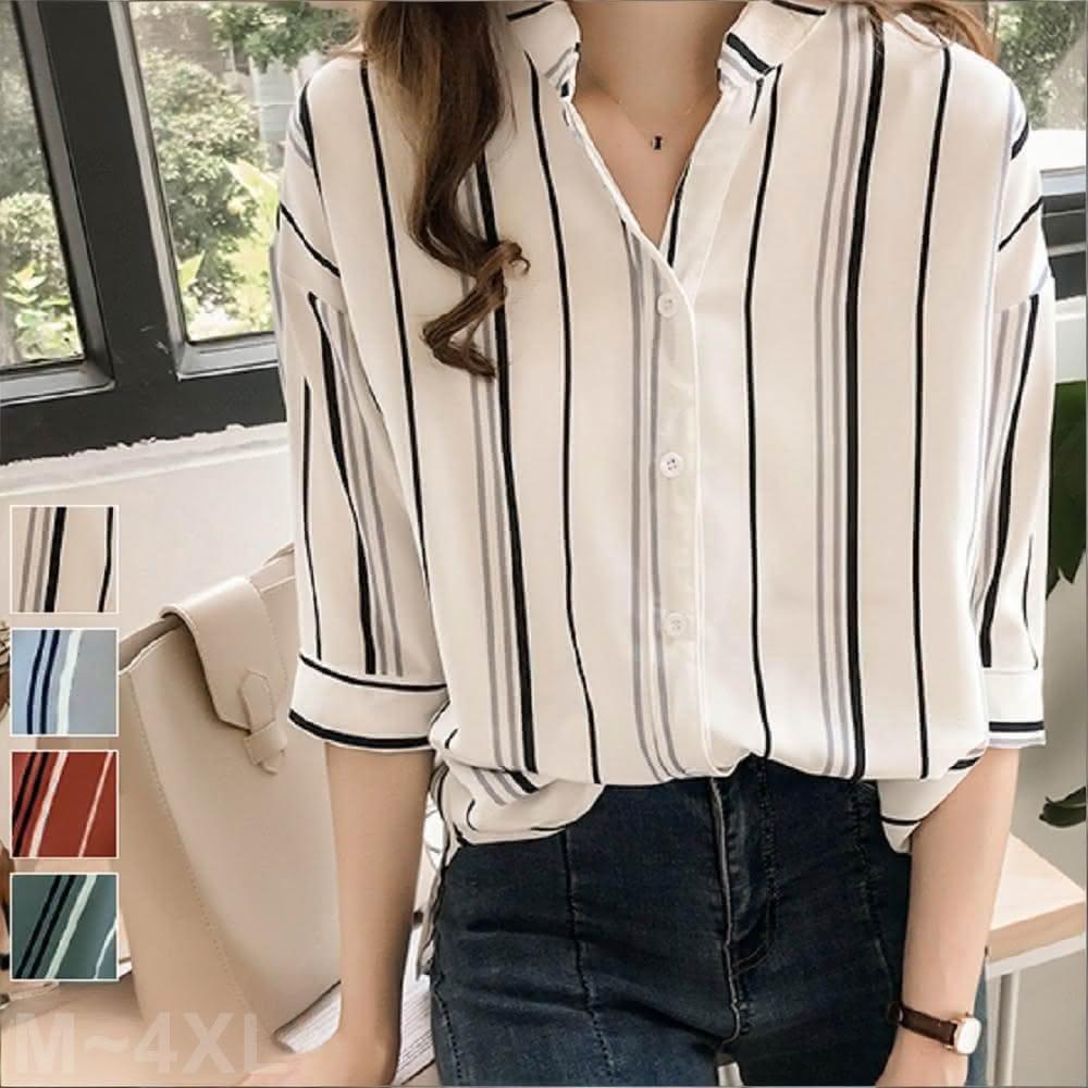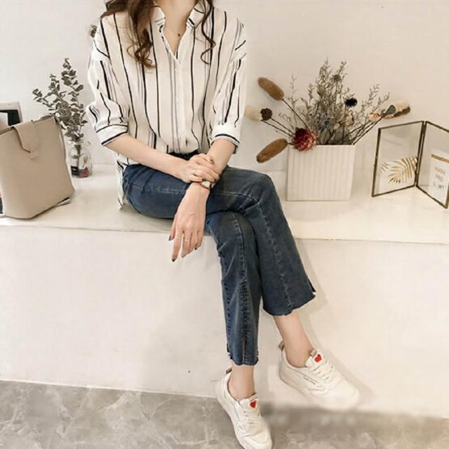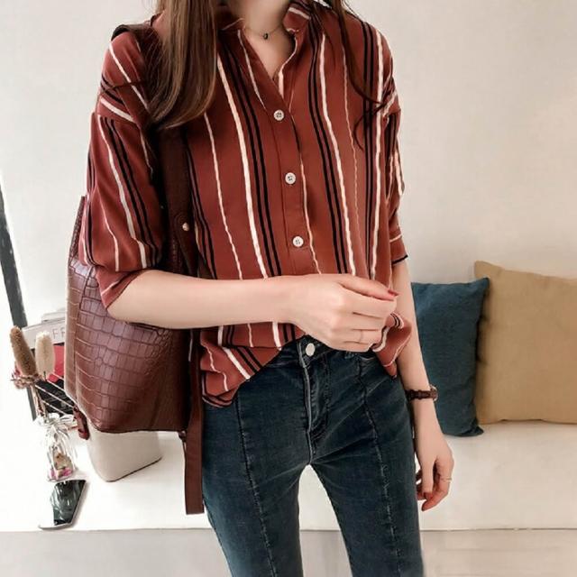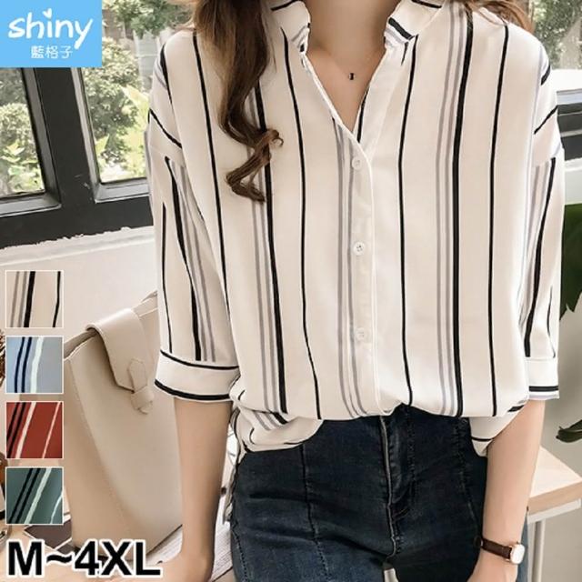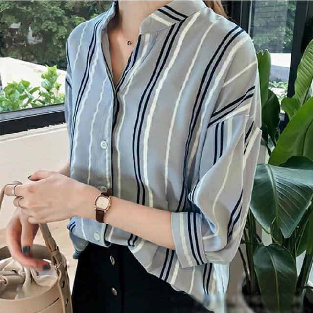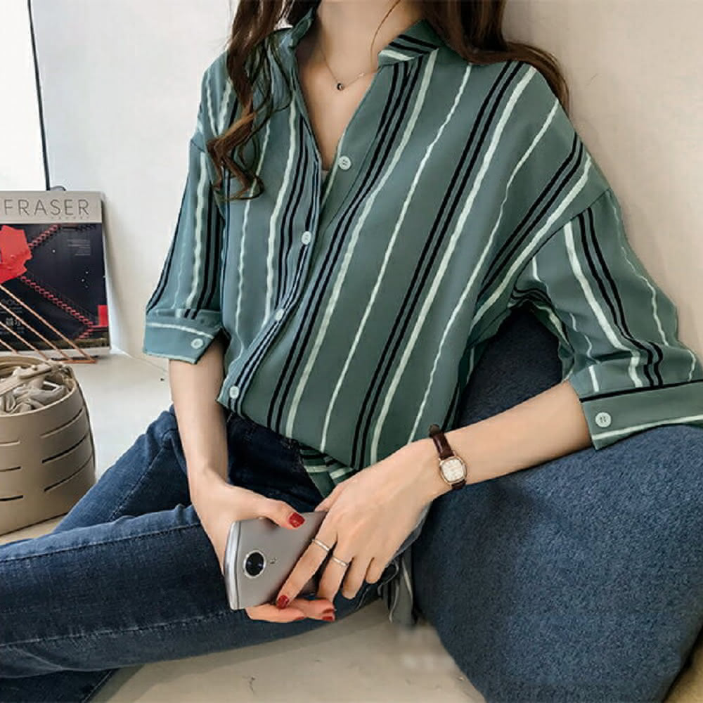 Shiny 藍格子撞色直條紋七分袖襯衫 V3540