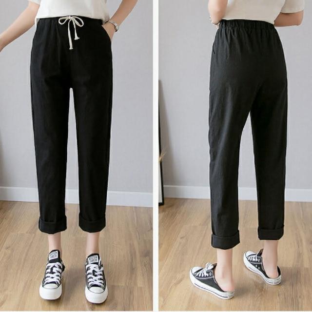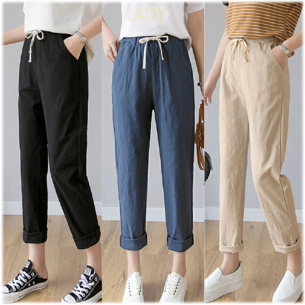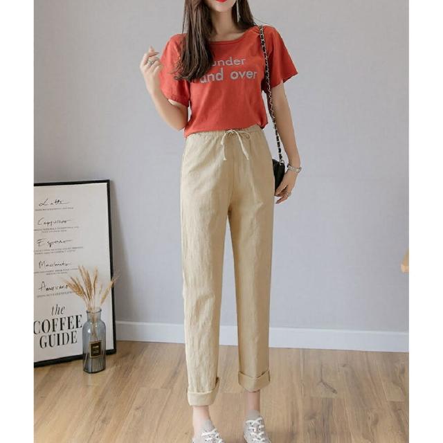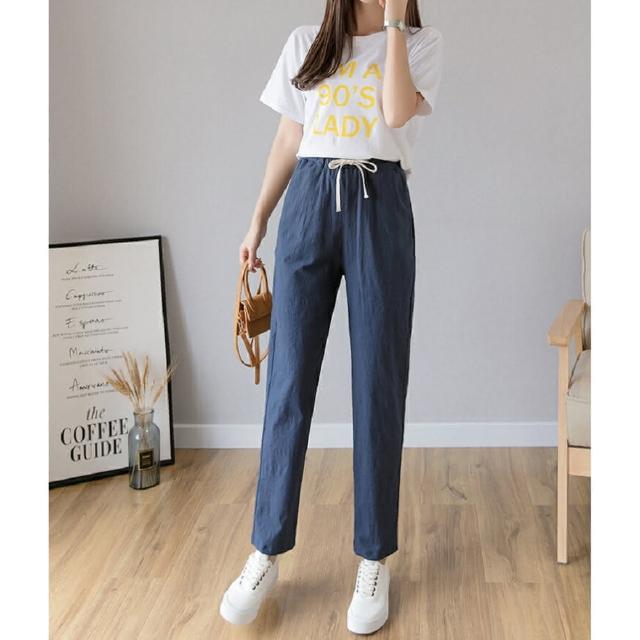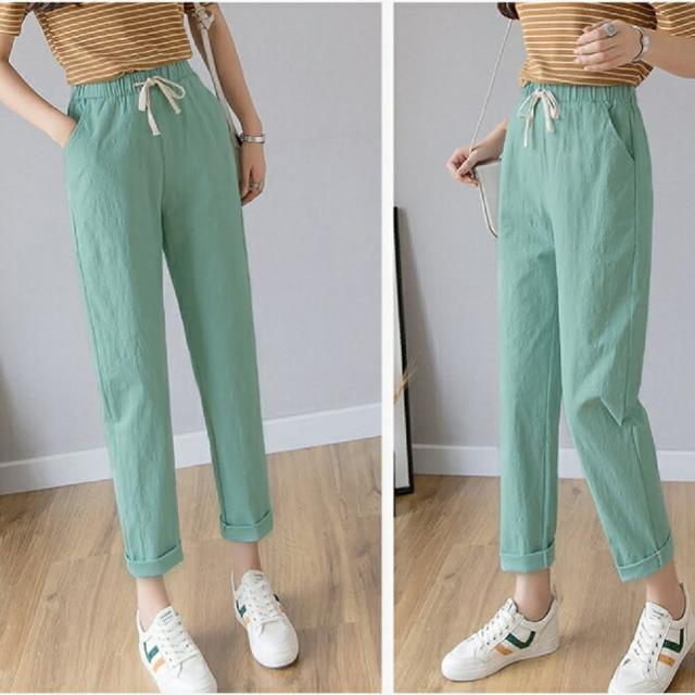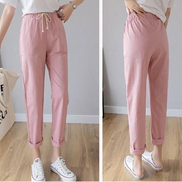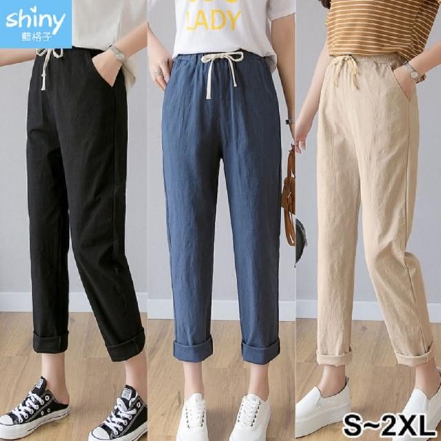 Shiny 藍格子粉嫩色系抽繩鬆緊腰哈倫棉麻九分褲 V3814(女褲 長褲)