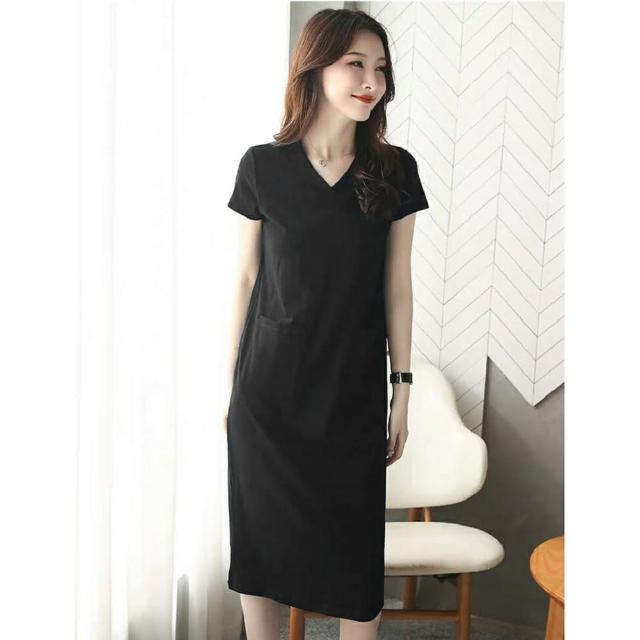 Shiny 藍格子純色V領中長款短袖連身裙洋裝 V3527(女裝 裙子)