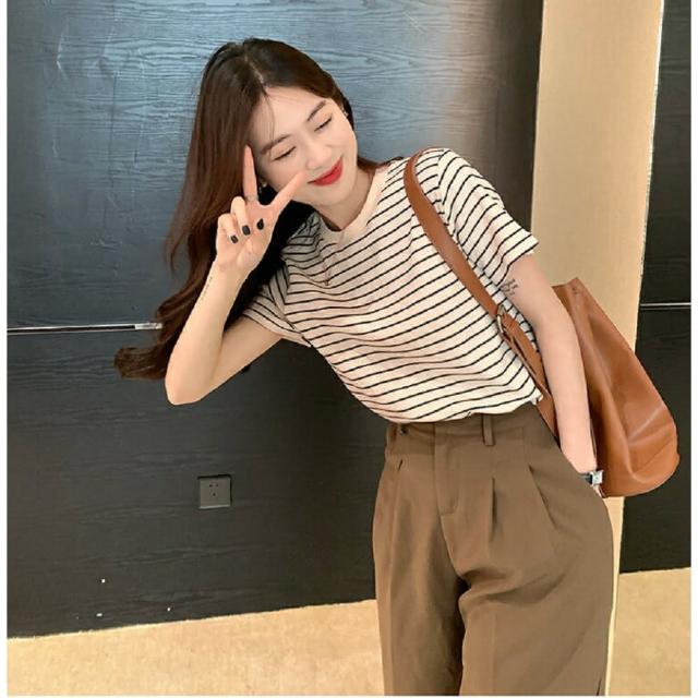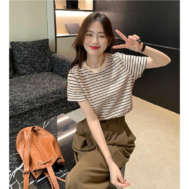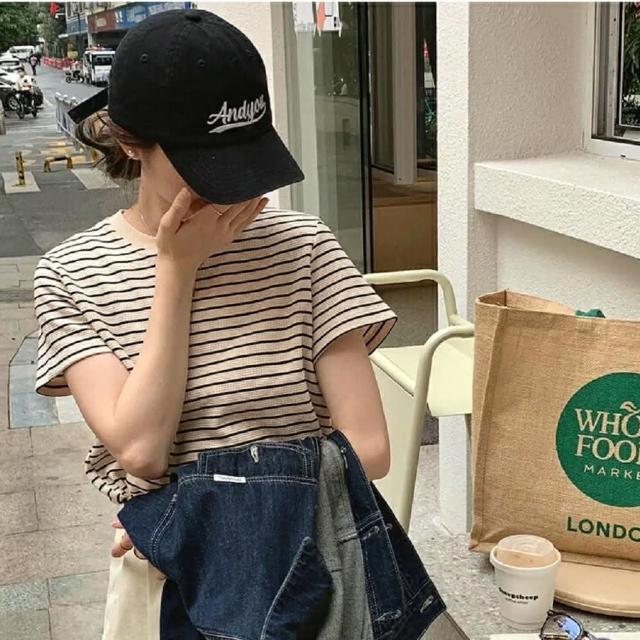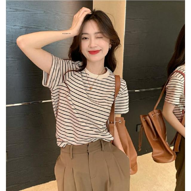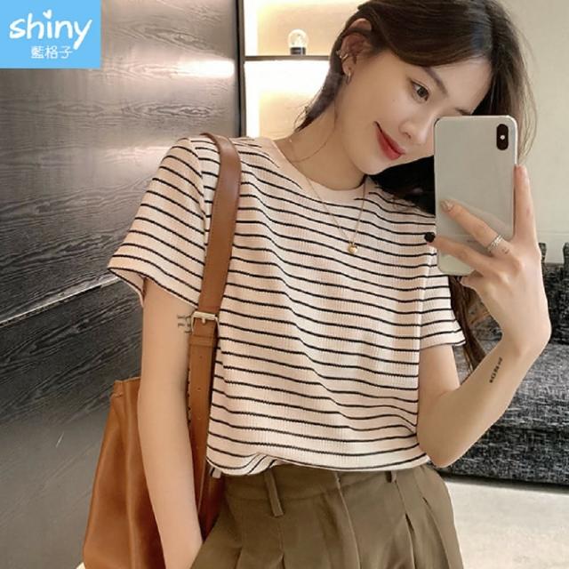 Shiny 藍格子好搭顯瘦條紋圓領短袖T恤上衣 V3780(女裝)