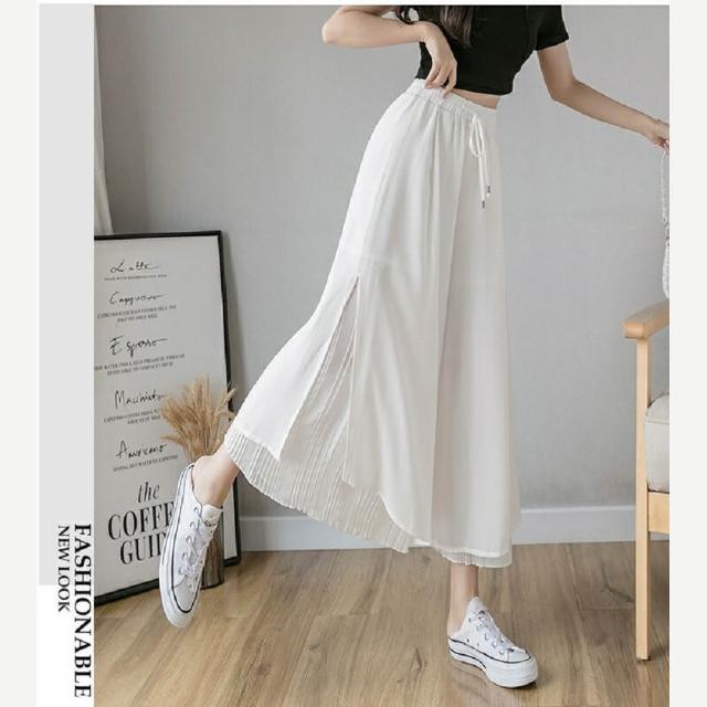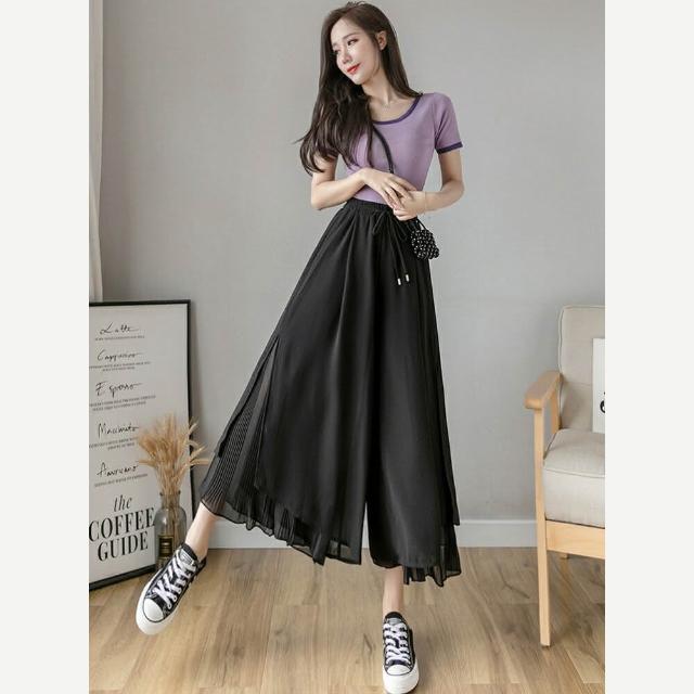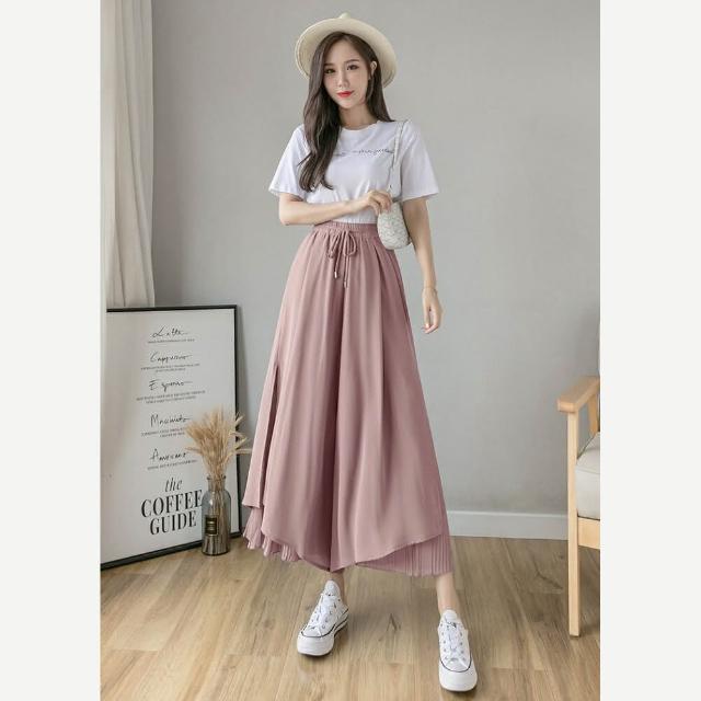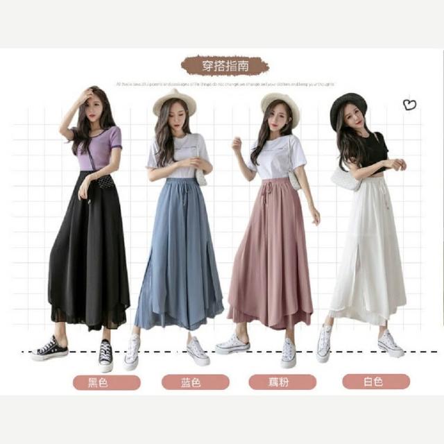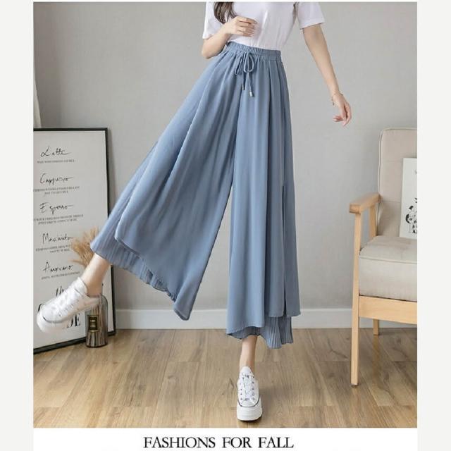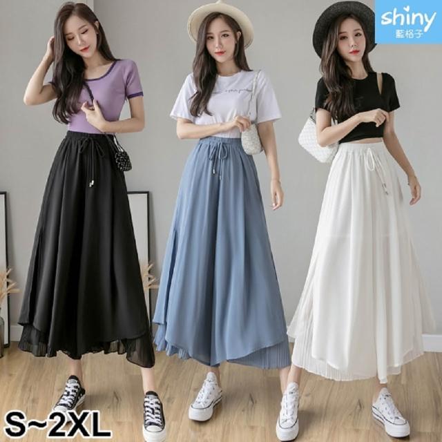 Shiny 藍格子純色高腰顯瘦垂感闊腿九分褲裙 V9325(女裝 雪紡 寬褲)