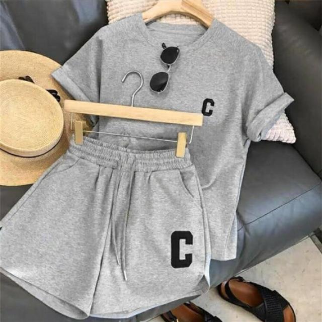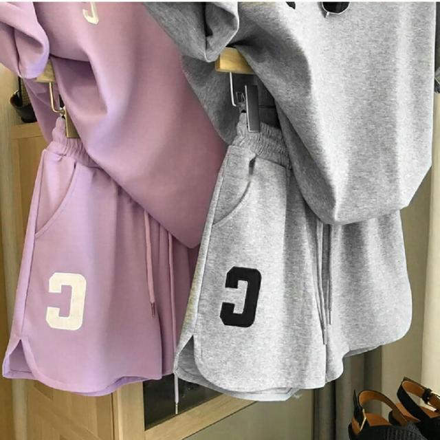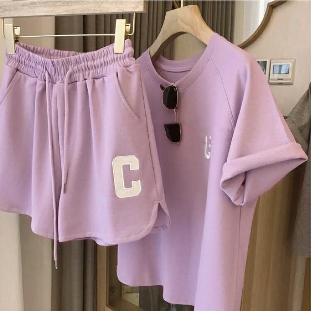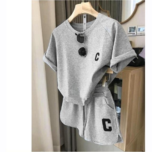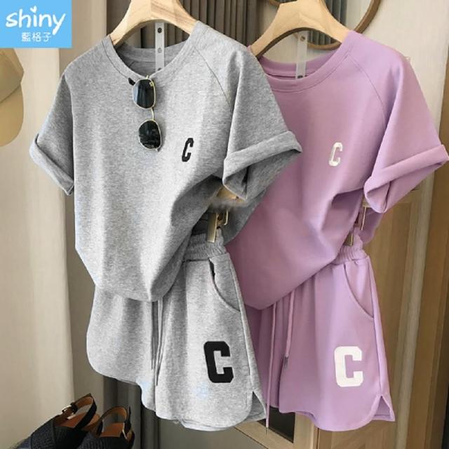 Shiny 藍格子字母C刺繡短袖上衣+鬆緊腰短褲兩件式套裝 V3760(女裝 運動 休閒)