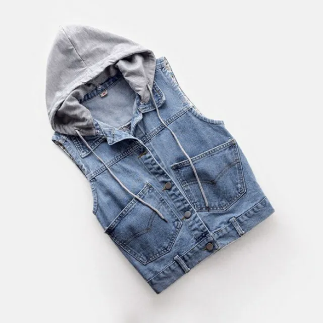 Shiny 藍格子百搭連帽無袖馬甲牛仔背心外套 V3092(女裝)
