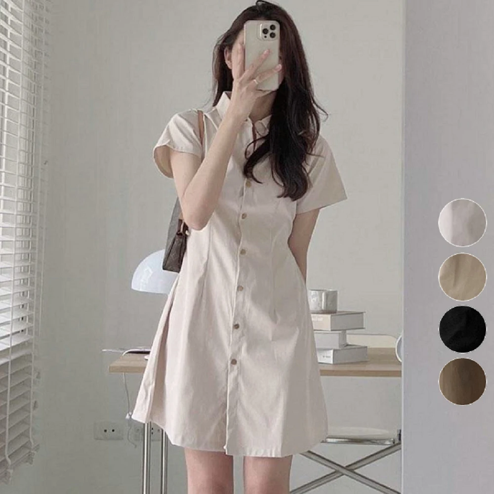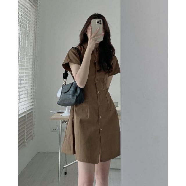 Shiny 藍格子素色翻領單排釦收腰顯瘦短袖襯衫式連身裙 V3840(女裝 洋裝 裙子 短裙 襯衫)