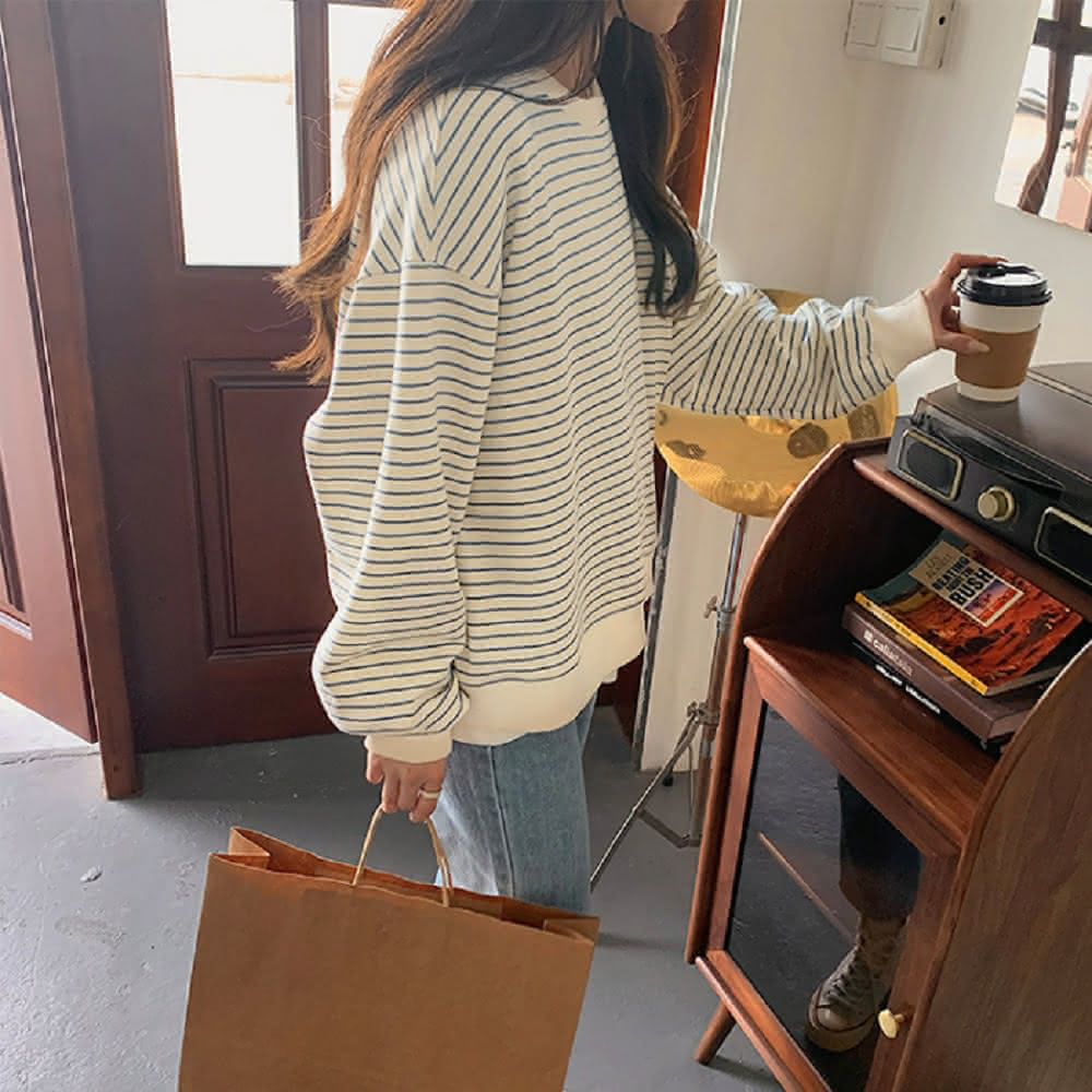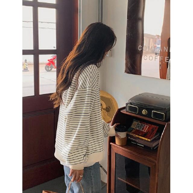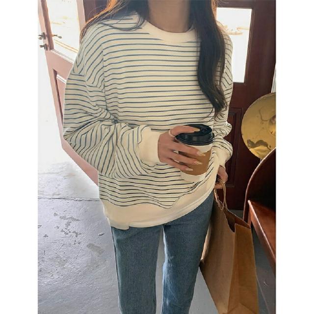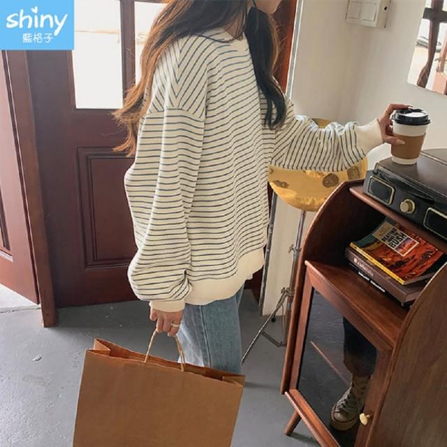 Shiny 藍格子經典條紋寬鬆圓領長袖T恤 V3852(女裝)