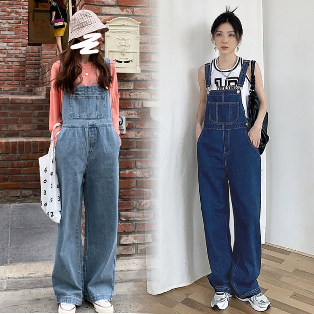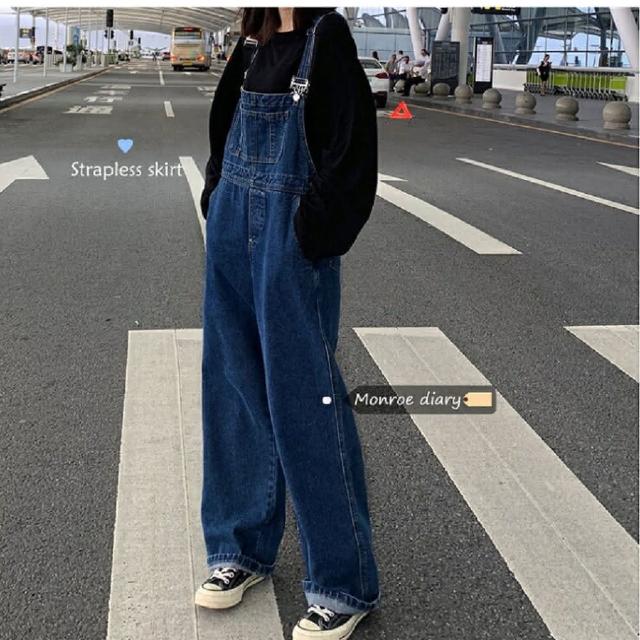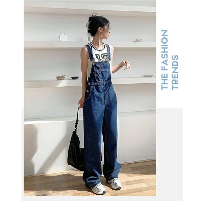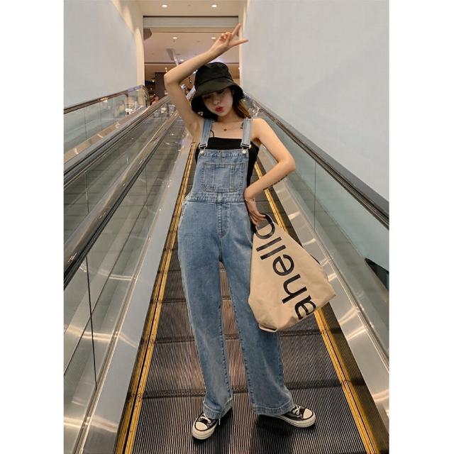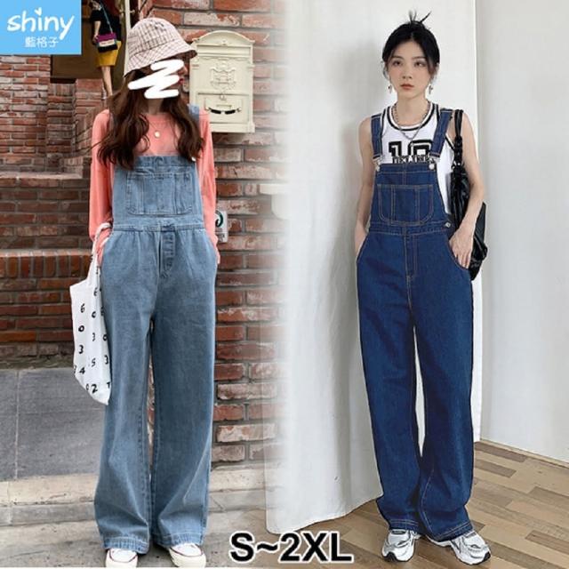 Shiny 藍格子顯瘦減齡大口袋水洗牛仔吊帶長褲 V3858(女褲 寬褲)