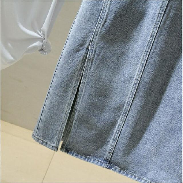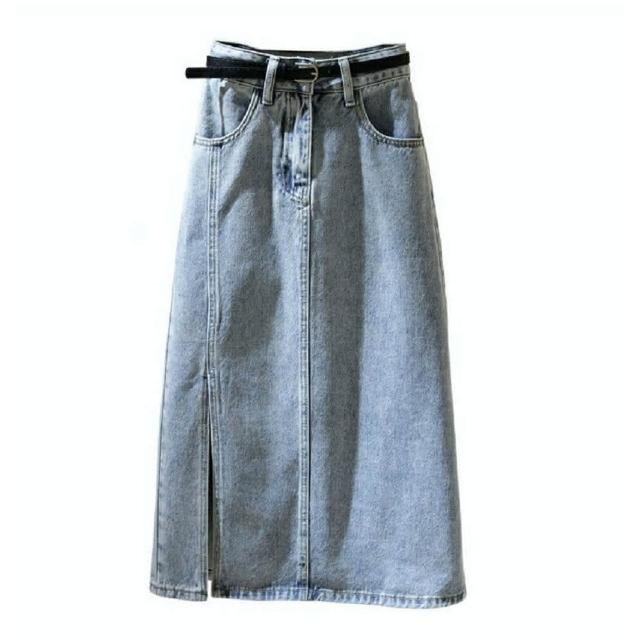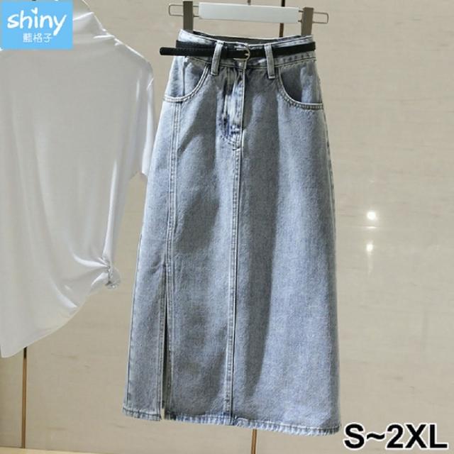 Shiny 藍格子高腰顯瘦包臀開叉擺牛仔中長A字裙 V3850(女裝 裙子 長裙)