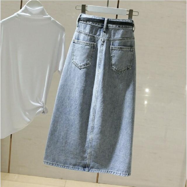 Shiny 藍格子高腰顯瘦包臀開叉擺牛仔中長A字裙 V3850(女裝 裙子 長裙)