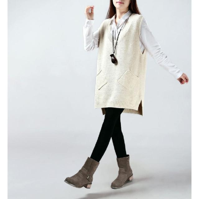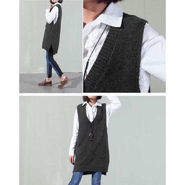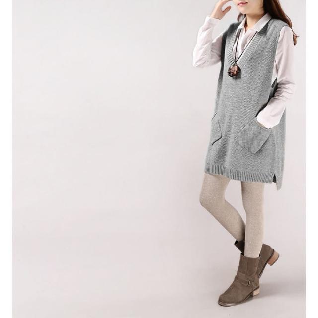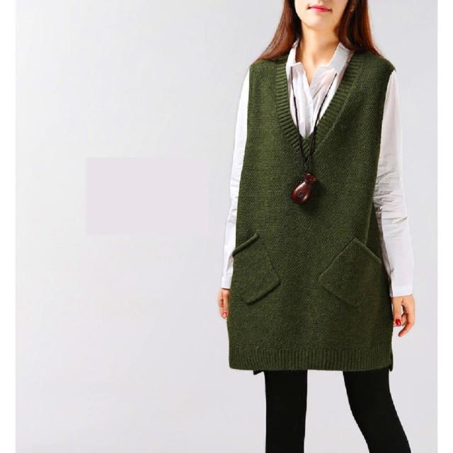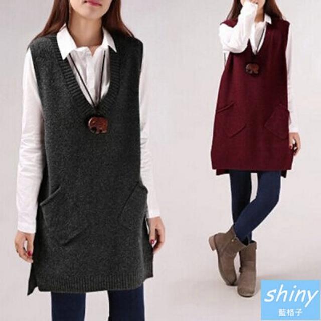 Shiny 藍格子V領雙口袋馬甲中長款側開叉毛衣背心 V1355(女裝 針織 裙子 連身裙)