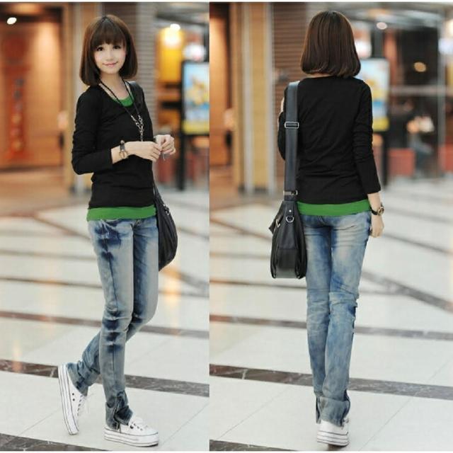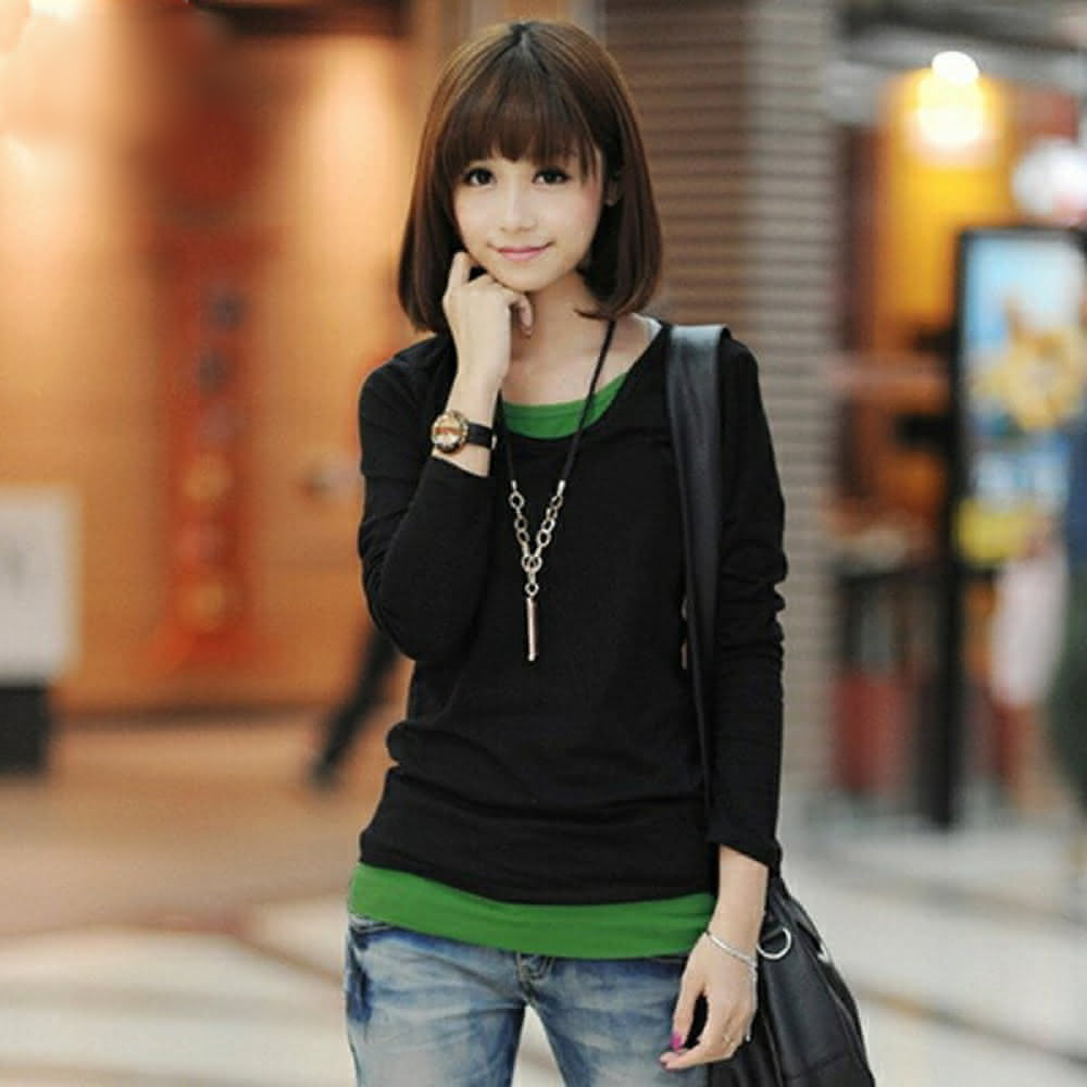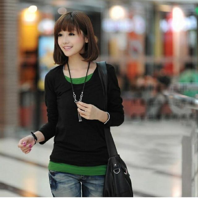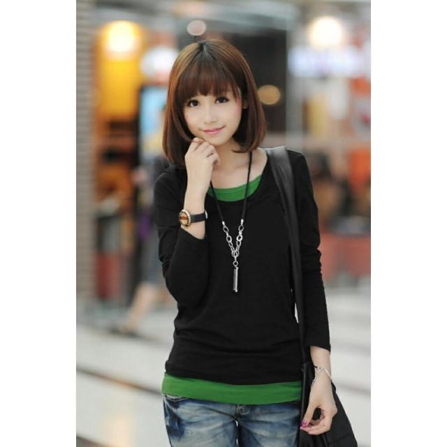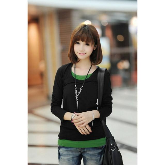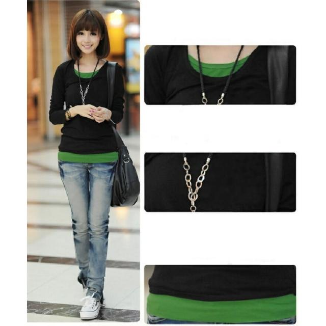 Shiny 藍格子假兩件圓領長袖上衣 V2775(女裝)