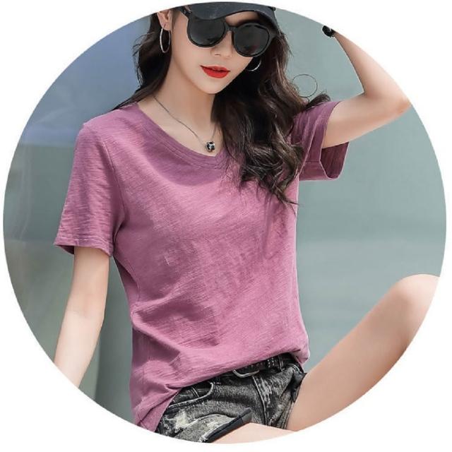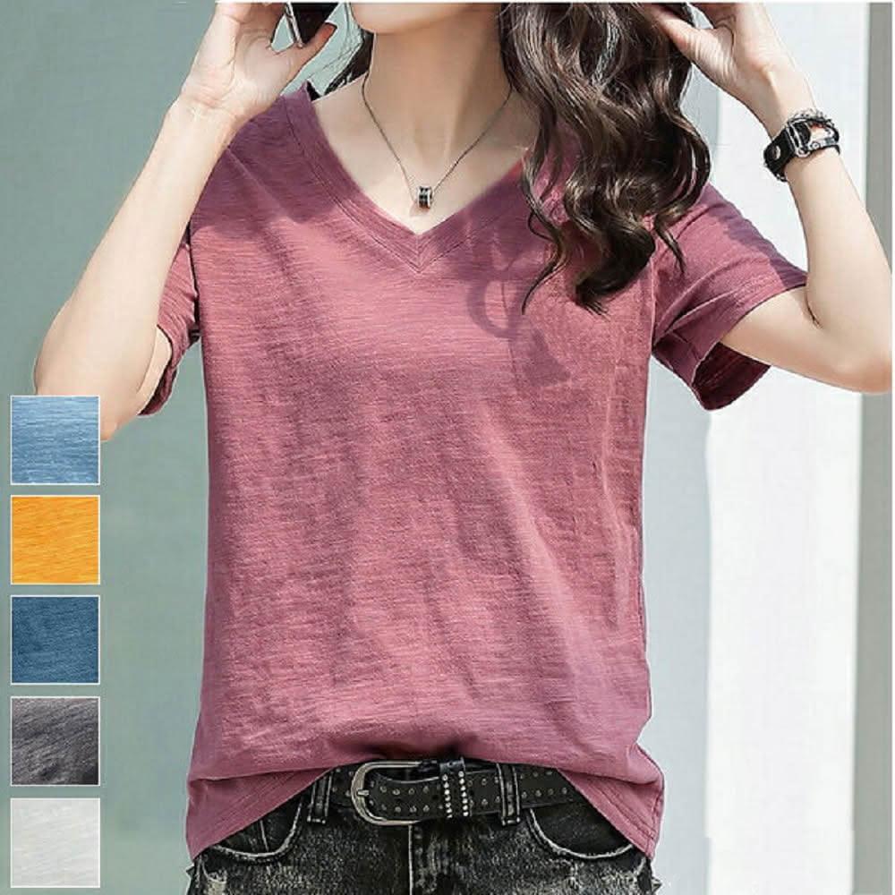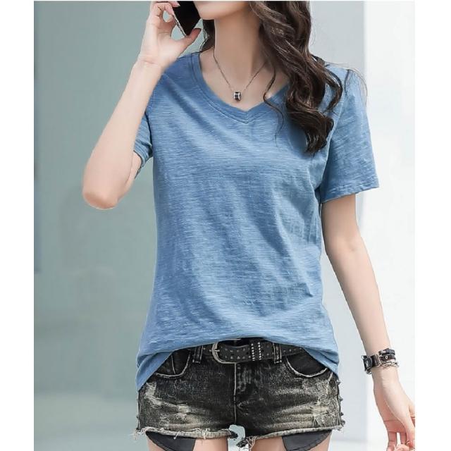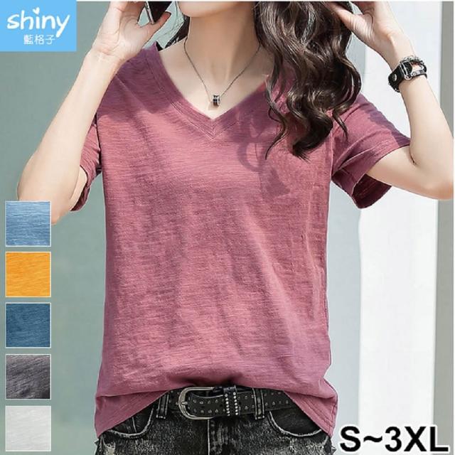 Shiny 藍格子純色V領竹節棉短袖上衣 V3594(女裝 T恤)