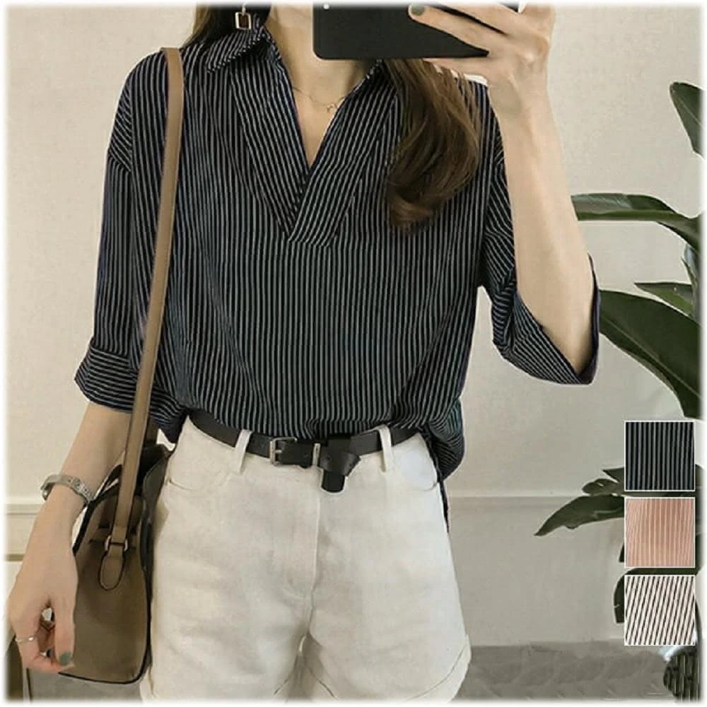 Shiny 藍格子條紋V領寬鬆顯瘦七分袖襯衫上衣 V2529(女裝 雪紡)