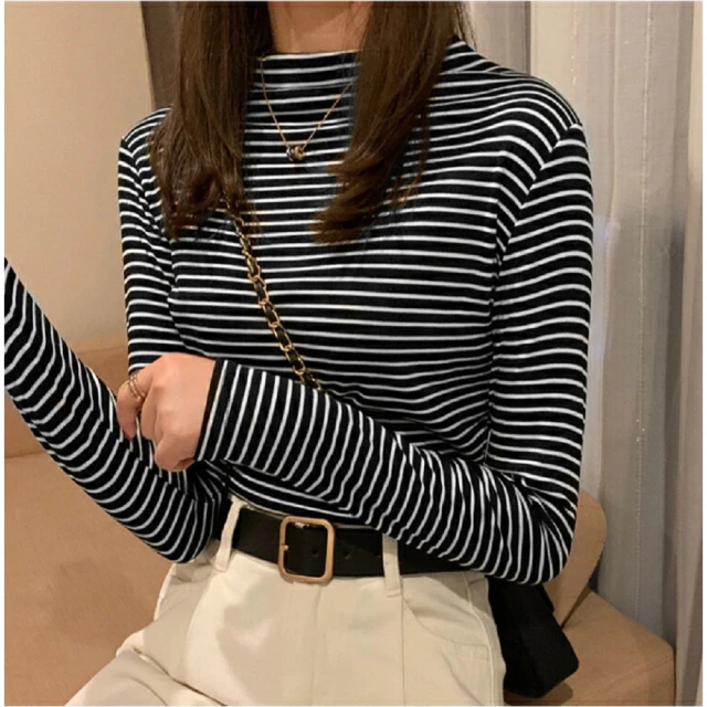 Shiny 藍格子經典黑白條紋高領內搭外穿長袖T恤 V3835(女裝)