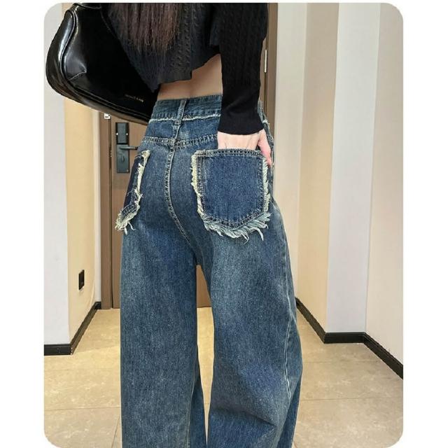Shiny 藍格子寬鬆高腰口袋毛邊直筒牛仔褲 V3871(女褲 長褲 寬褲)