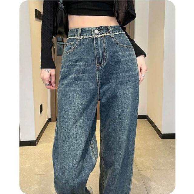 Shiny 藍格子寬鬆高腰口袋毛邊直筒牛仔褲 V3871(女褲 長褲 寬褲)