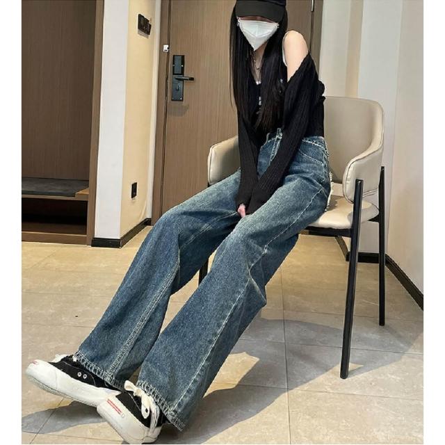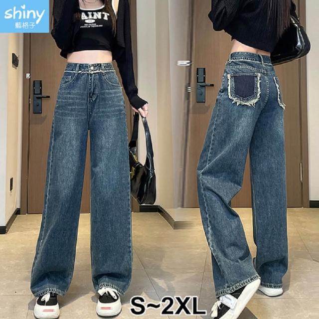 Shiny 藍格子寬鬆高腰口袋毛邊直筒牛仔褲 V3871(女褲 長褲 寬褲)
