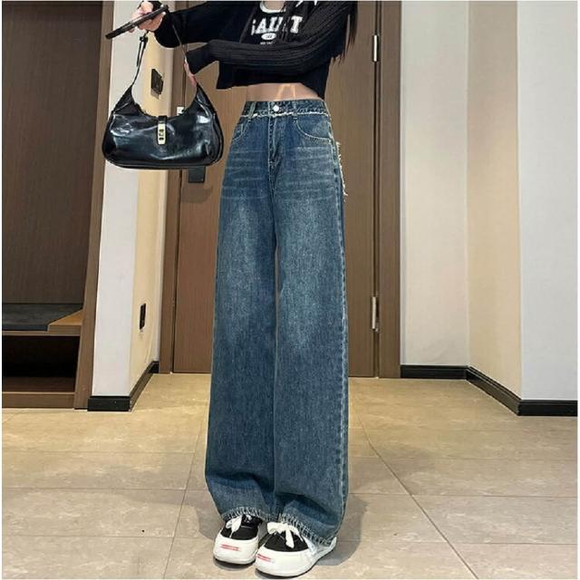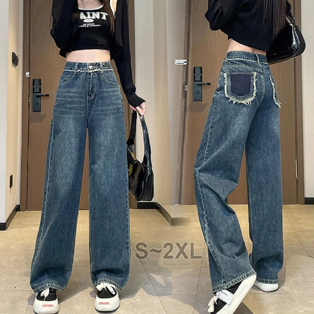 Shiny 藍格子寬鬆高腰口袋毛邊直筒牛仔褲 V3871(女褲 長褲 寬褲)