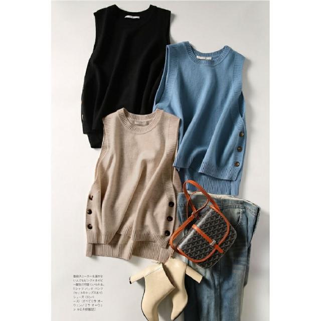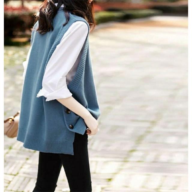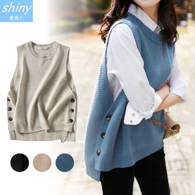 Shiny 藍格子側排扣圓領前短後長外搭針織背心 V3669(女裝 馬甲 毛衣)