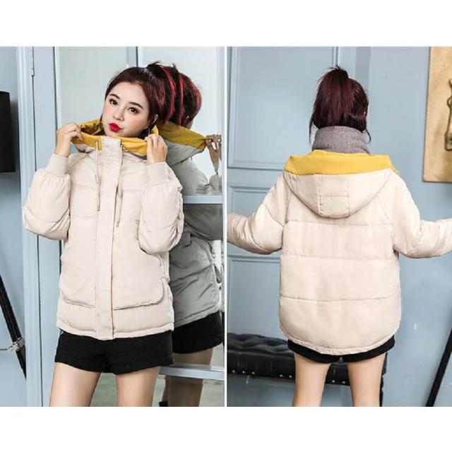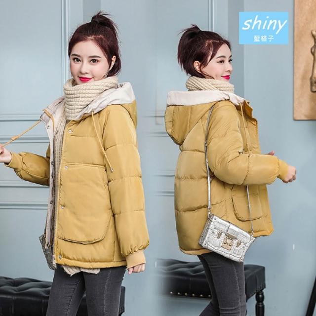 Shiny 藍格子冬季寬鬆加厚短款鋪棉棉襖外套 V9215(女裝 保暖 連帽 風衣)