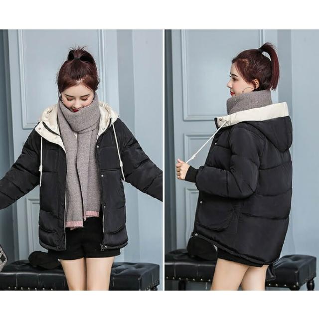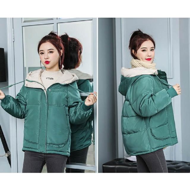 Shiny 藍格子冬季寬鬆加厚短款鋪棉棉襖外套 V9215(女裝 保暖 連帽 風衣)