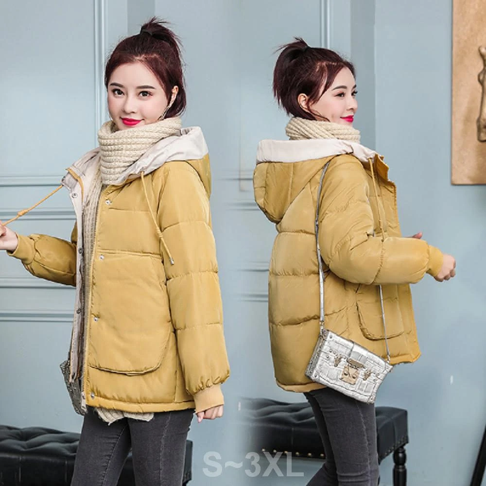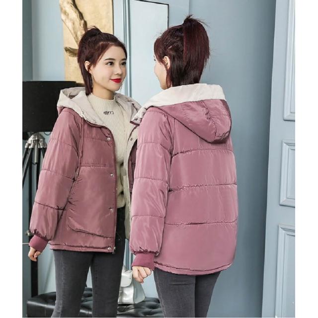 Shiny 藍格子冬季寬鬆加厚短款鋪棉棉襖外套 V9215(女裝 保暖 連帽 風衣)