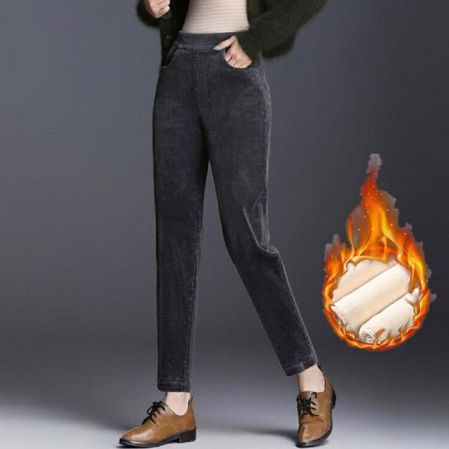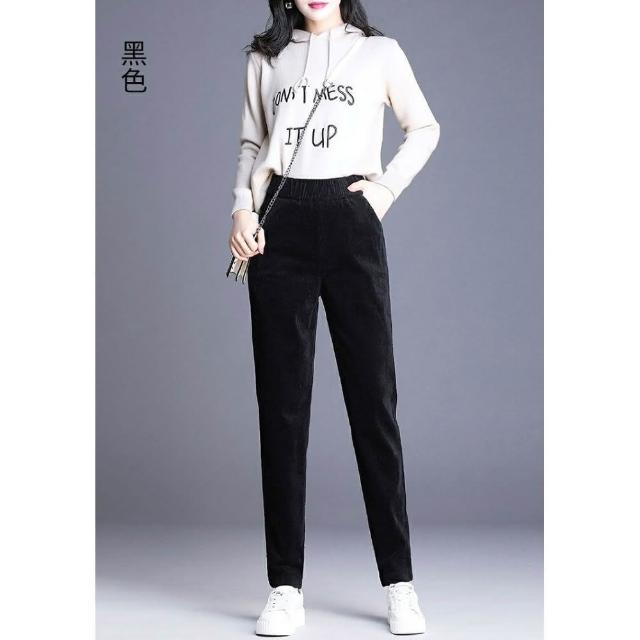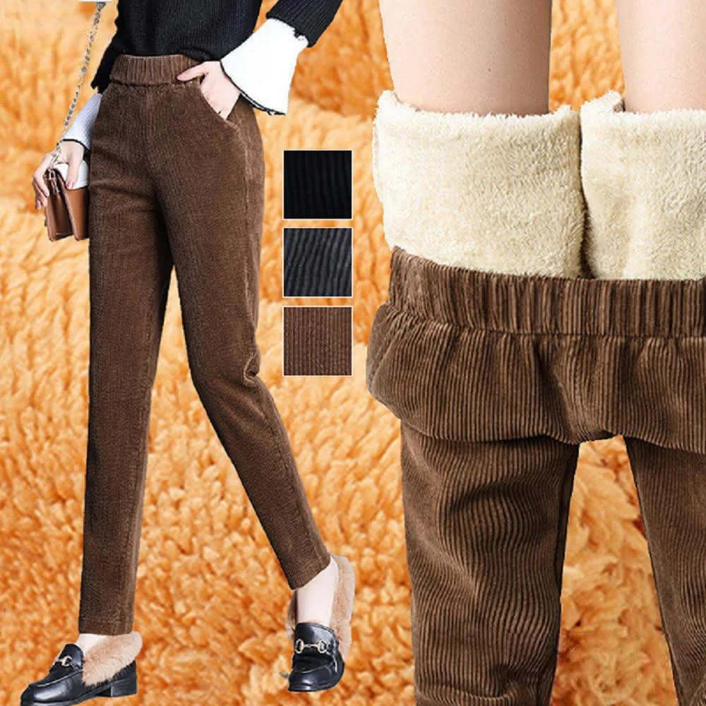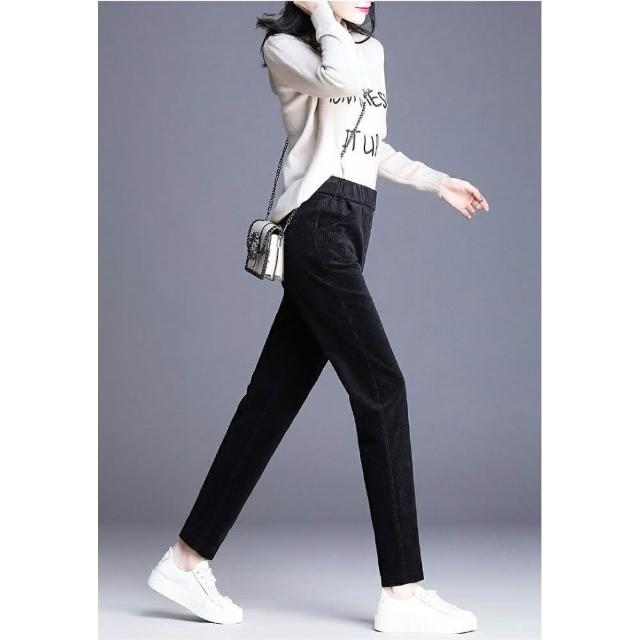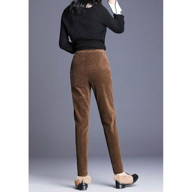 Shiny 藍格子冬季高腰加厚羊羔燈芯絨長褲 V9391(女裝 保暖)