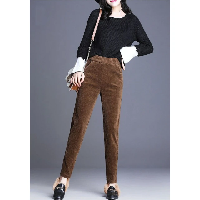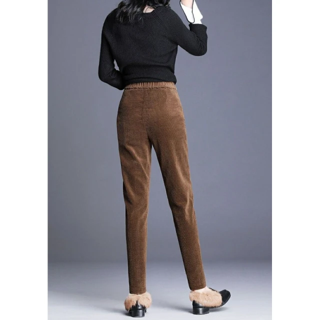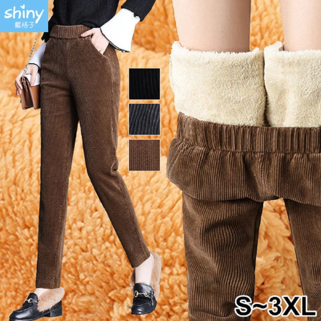 Shiny 藍格子冬季高腰加厚羊羔燈芯絨長褲 V9391(女裝 保暖)