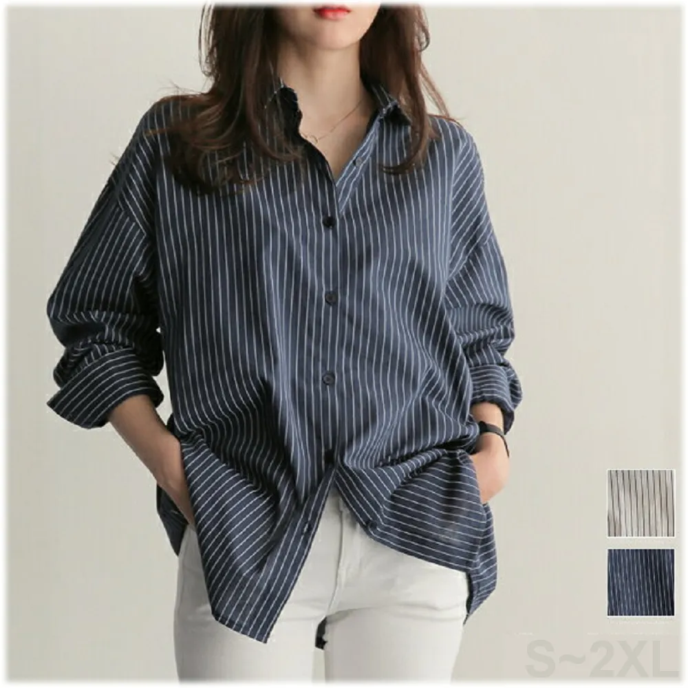 Shiny 藍格子文青質感翻領條紋長袖襯衫 V3394(女裝)