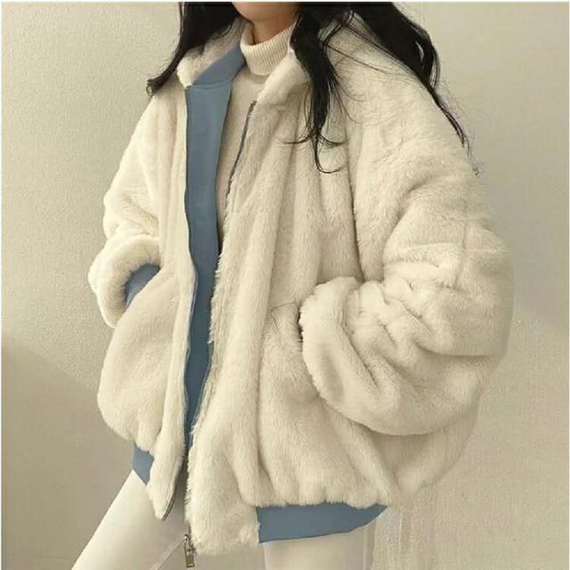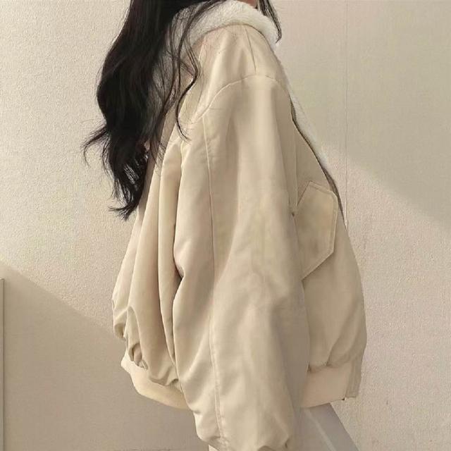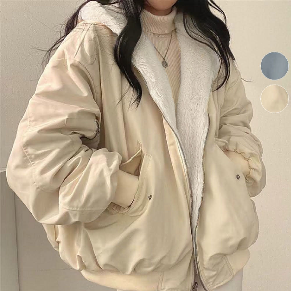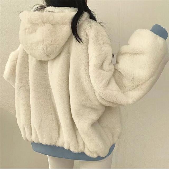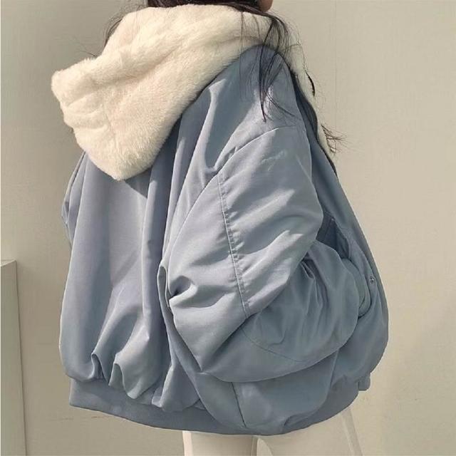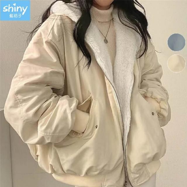 Shiny 藍格子素色絨毛加厚兩面穿拉鍊連帽外套 V3908(女裝 鋪棉 風衣 夾克)